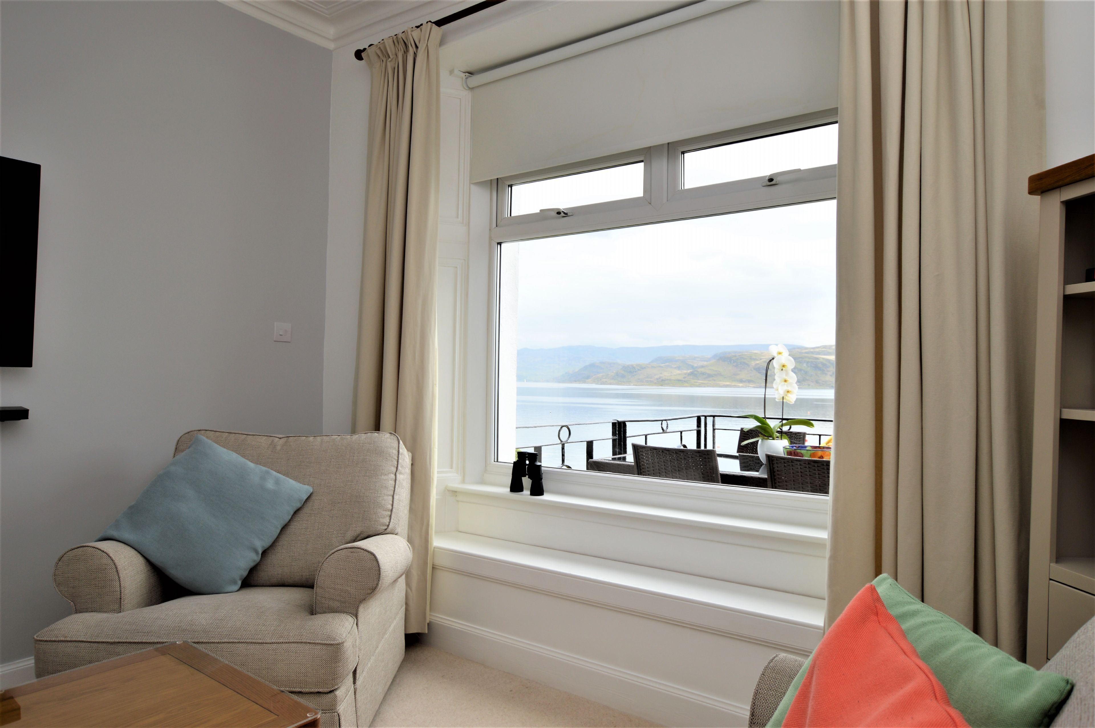 - Sitting room with two bay windows, wood-burning stove, comfortable seating, TV and stunning views accross Loch Fyne
