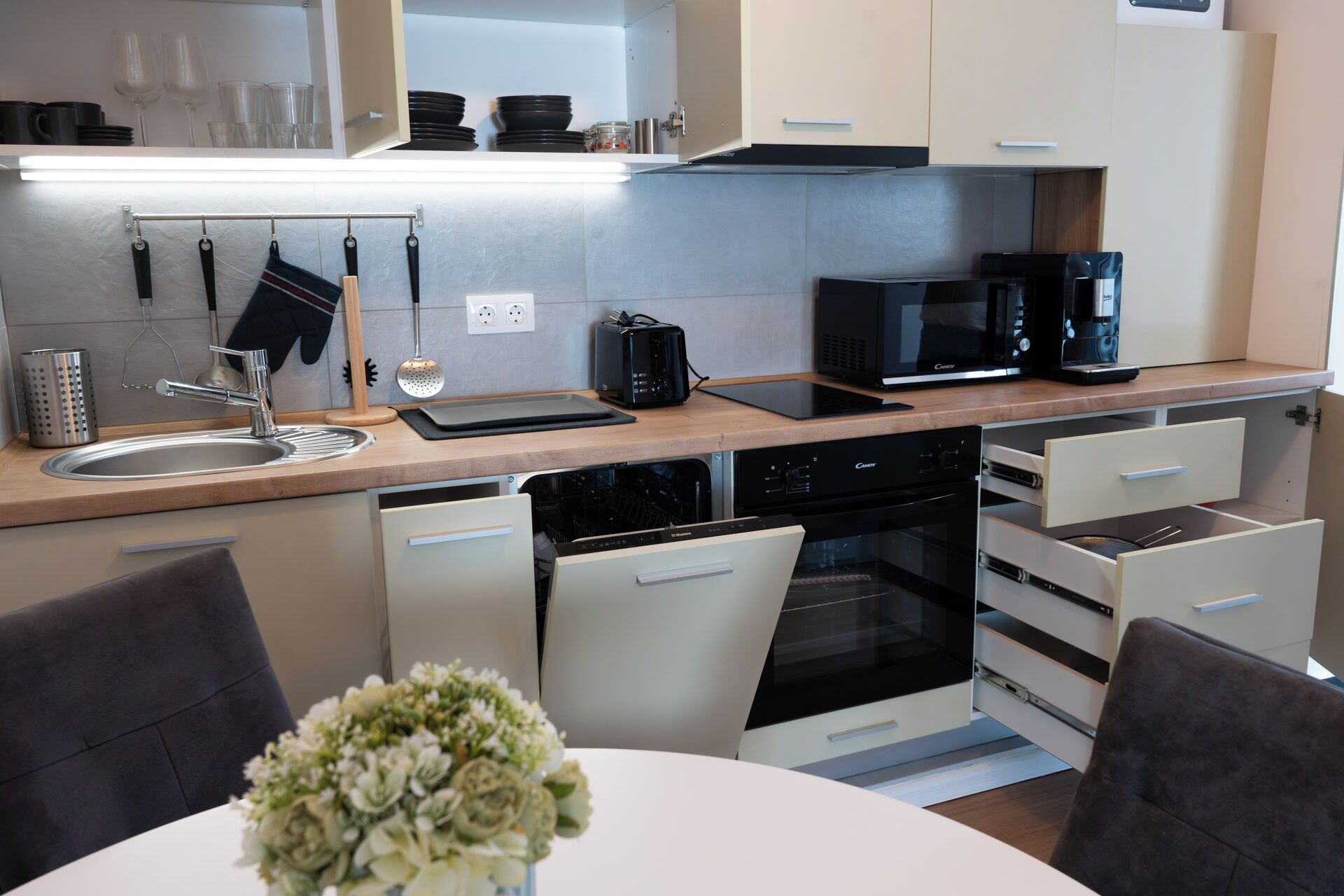 The accommodation offer includes all the necessary supplies for the bathroom, kitchen and the operation of the apartment.