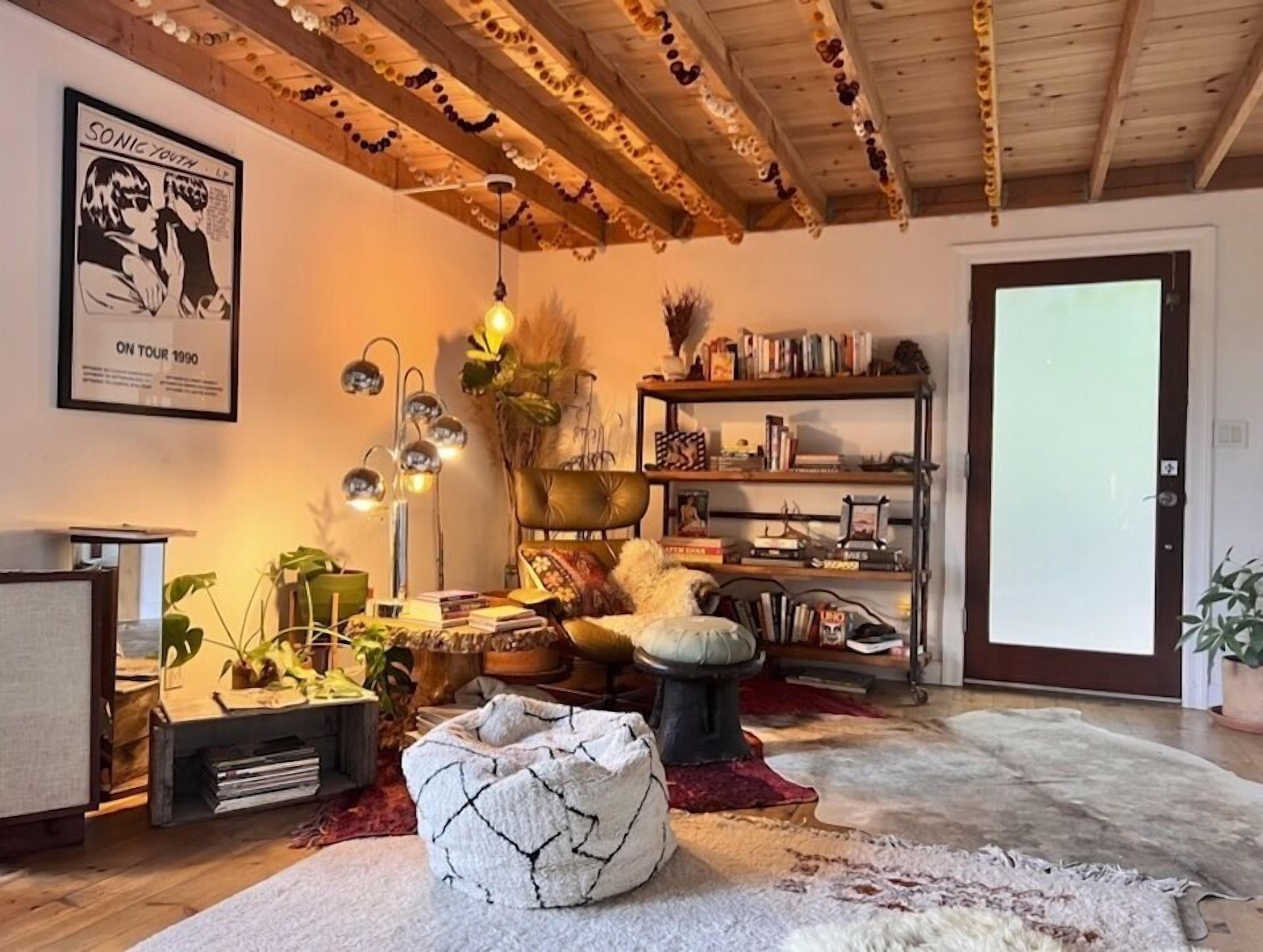Nestled in nature, this 2 story home flooded with natural light hosts an open floor plan of full chef's kitchen + living room/library upon entrance. Up the main stairs is the Moroccan lounge/2nd bedroom which features views of the green outdoors and coffee table/floor pillows. Split level stairs lead to the master bed, followed by an artist studio in the back with a massive desk to do your work at or create on while overlooking the lush vegetation of the canyon. The master bath is dressed with viney plants hung across with a deep jacuzzi tub that comfortably fits 2. Try some of the bath salt and body scrubs that's stocked from local Topanga shop of natural and organic self care goods, The Well, and enjoy yourself a restorative spa night. Out back you'll find a large deck with a dining table that seats up to 8 surrounded by juniper trees and the serenade of birds and crickets. Around the corner from the grill, stairs lead to the backyard with outdoor seating and hammocks to read, meditate, nap, enjoy coffee, gaze at the sky, whatever your heart desires.