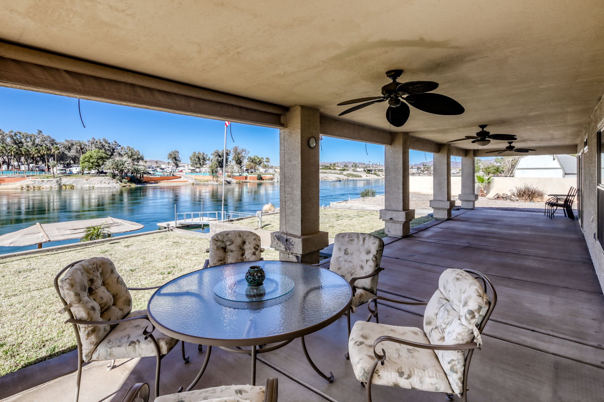 Once you check in, there will be no reason to leave. With 152 feet of private beach frontage on the Colorado River, our four bedroom home has everything you'll need to have a truly epic vacation! Nestled on over three-quarters of an acre, you'll have plenty of room for all of your water and desert toys including space for RV hookups! Launch your boat or jet skis on the launch ramp or enjoy sunsets on the dock. Waterway runs from Laughlin all the way down to Lake Havasu! This is truly a one-of-a-kind property that has it all!