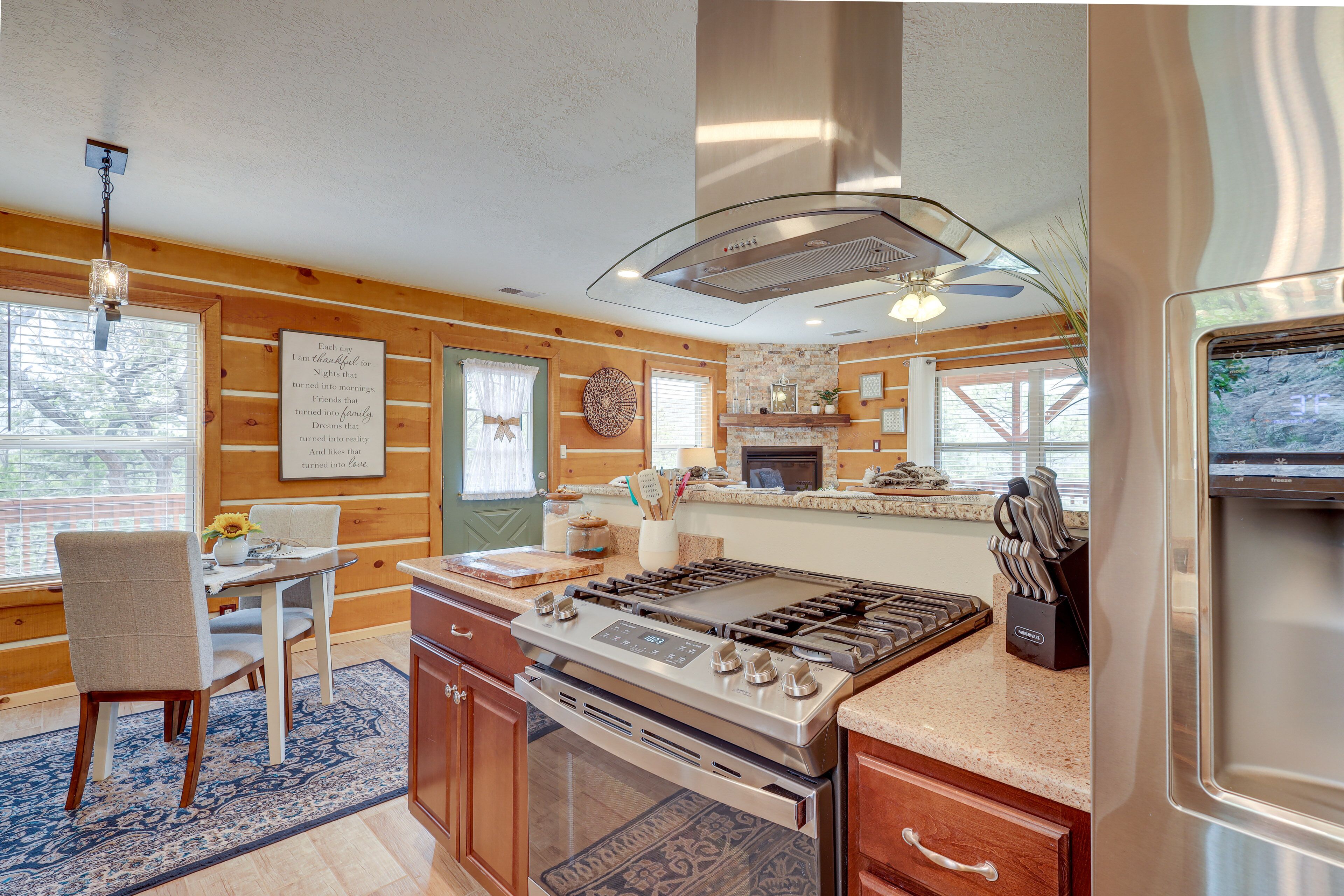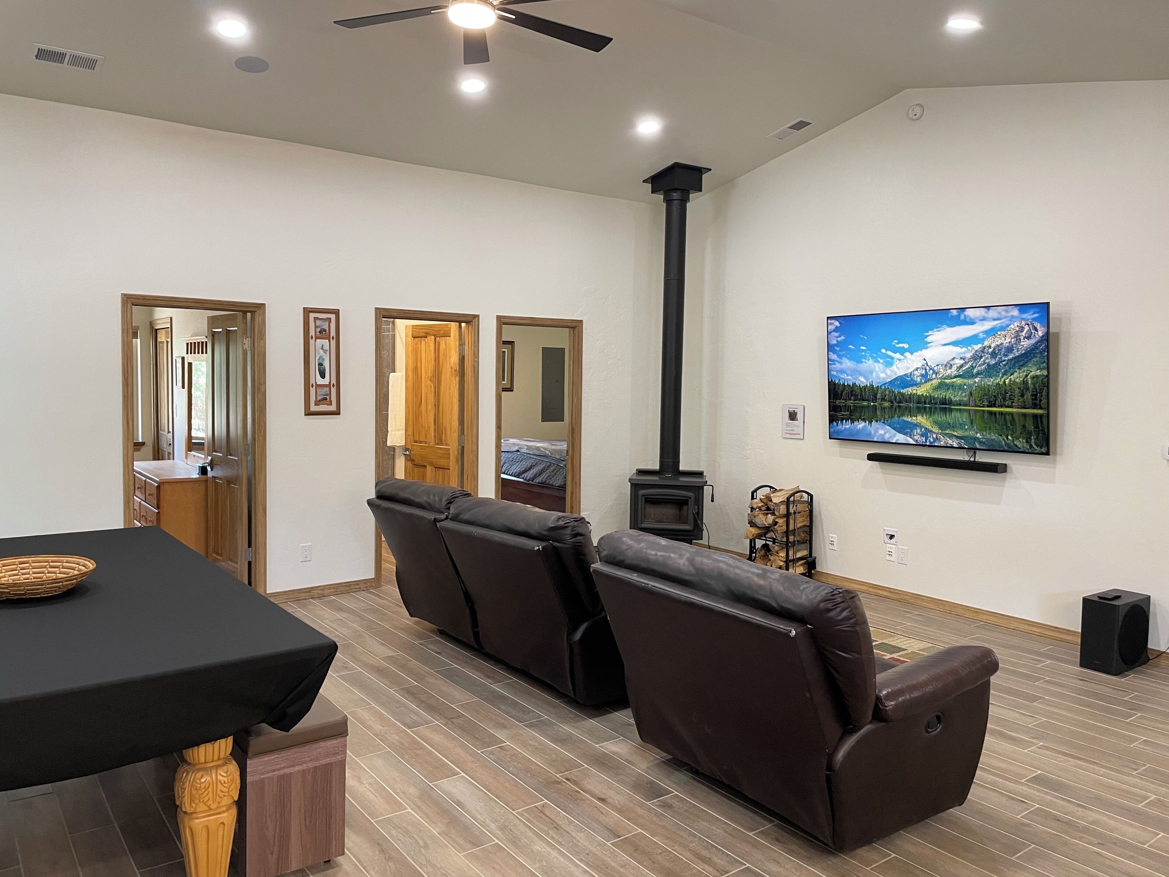 A large open kitchen, dinning & living space with vaulted ceilings and pendent lighting is situated in the middle of the home. Windows throughout the room provide natural lighting and beautiful sights at every angle. There are two counter height bar stools and 4 rolling chairs w/bench seating at the dining area, seating 8 comfortably for meals. Massive custom designed granite countertops provide plenty of space for the ideal family gathering. There is a kiva in the room to warm yourself during the winter. Updated living room furniture & a massive Firestick TV (with Pluto TV) is fixed to the wall. New Oven (23'), current hot tub is new as of April 23 (24 hours to warm).