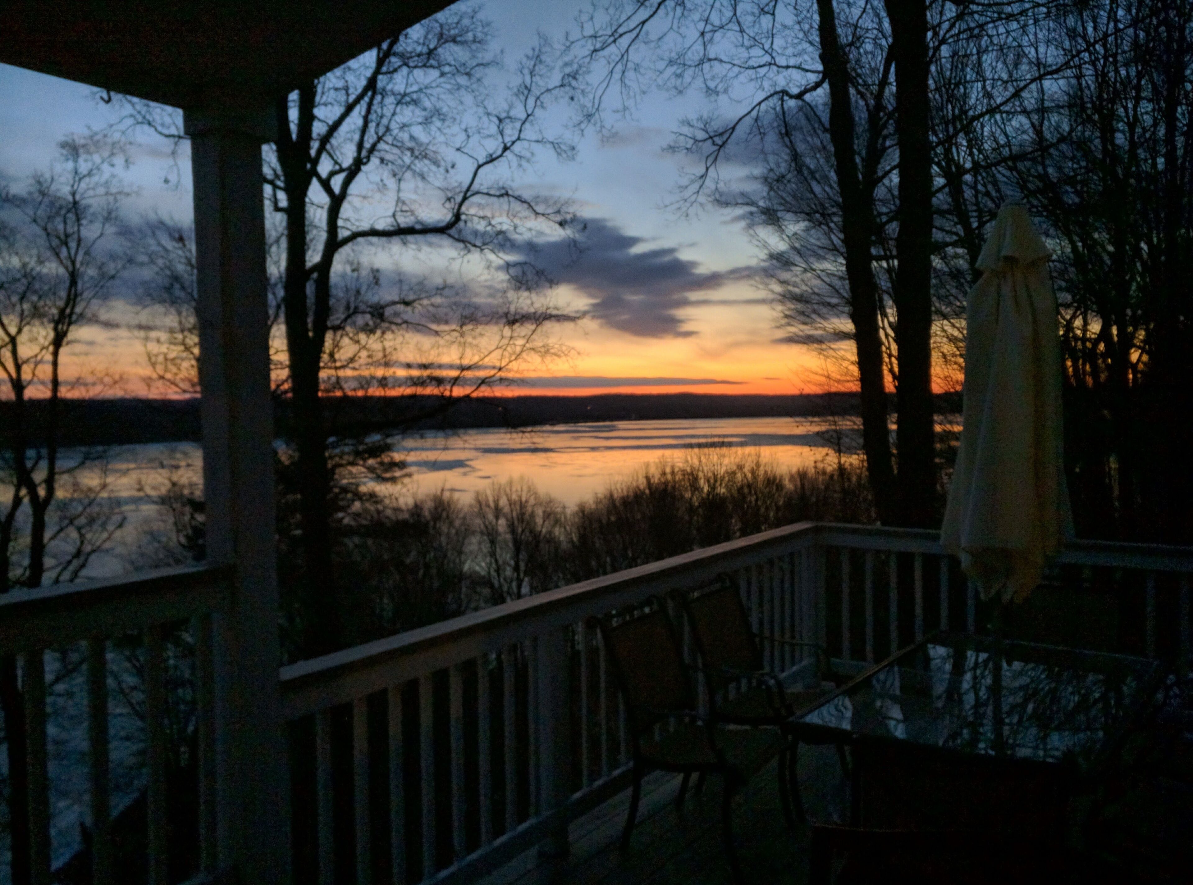 Facing east there is a large window wall for the morning sunrise and in the west, for the sunset, 3 sets of French doors and 2 windows. The 3 French doors open to a wraparound deck with lounge chair and teak dinning table, chairs and gas grill, overlooking a beautiful pond with a waterfall. There are benches and swings on the land to sit, and a fire pit to enjoy fires at night, seating close to the pond and a bridge over s small stream. The pond is swimmable and we just installed a new floating dock to swim to. We only use solar energy.
