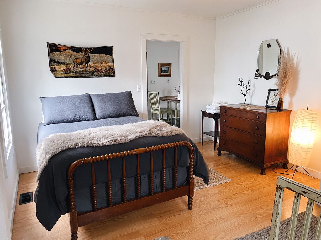 Nestled into the hillside overlooking thorny bramble patches that grow berries in the summer and are home to rabbits, birds, and pollinators. The back of the wrap-around porch hovers over the land and gives the feeling of being in a tree house or high up in a nest. The interior is thoughtfully decorated with our personal family heirlooms as well as locally thrifted vintage pieces.