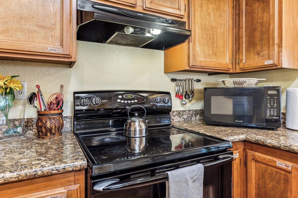 * The kitchen is fully equipped with a gas cooktop, oven, microwave, stainless steel refrigerator, microwave, coffee machine, mug, dishes & bowls, utensils, can opener, knives, pots, pans, and more.