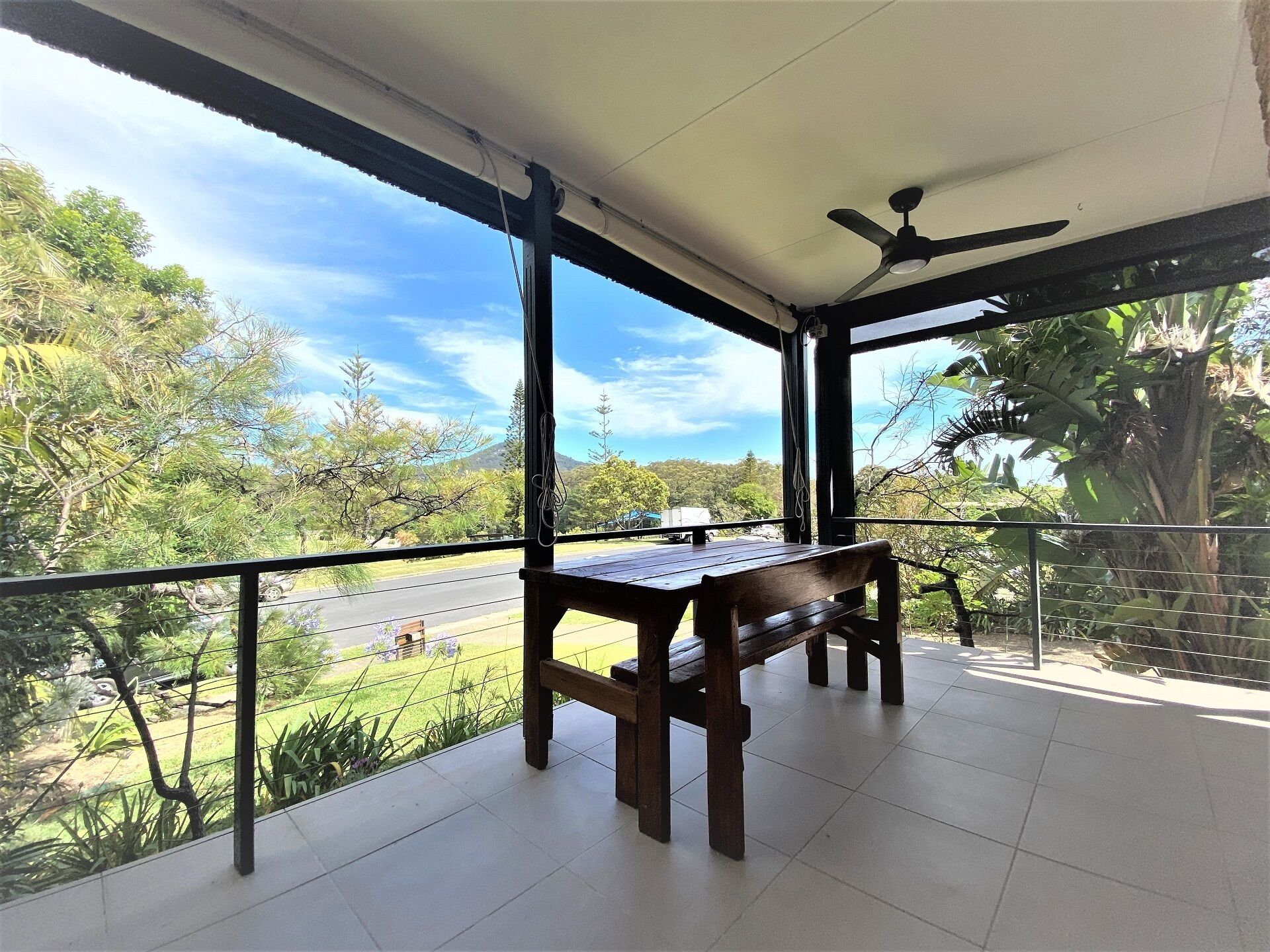 This cosy property has an open floor plan including the kitchen, dining and lounge area. Throughout the house there is an air conditioner and ceiling fans maximizing comfort for tenants. With its own electronic blinds is the deck situated at the front of the property that overlooks the park land and distant mountain view's creating a tranquil atmosphere. There are two bedrooms that both have built-in wardrobes being convenient for holiday guests. The main bedroom has access to the two-way bathroom, there is also a separate toilet accessible for tenants when the bathroom is occupied. At the back of the property there is a private outdoor area where you can sit back and relax or entertain.