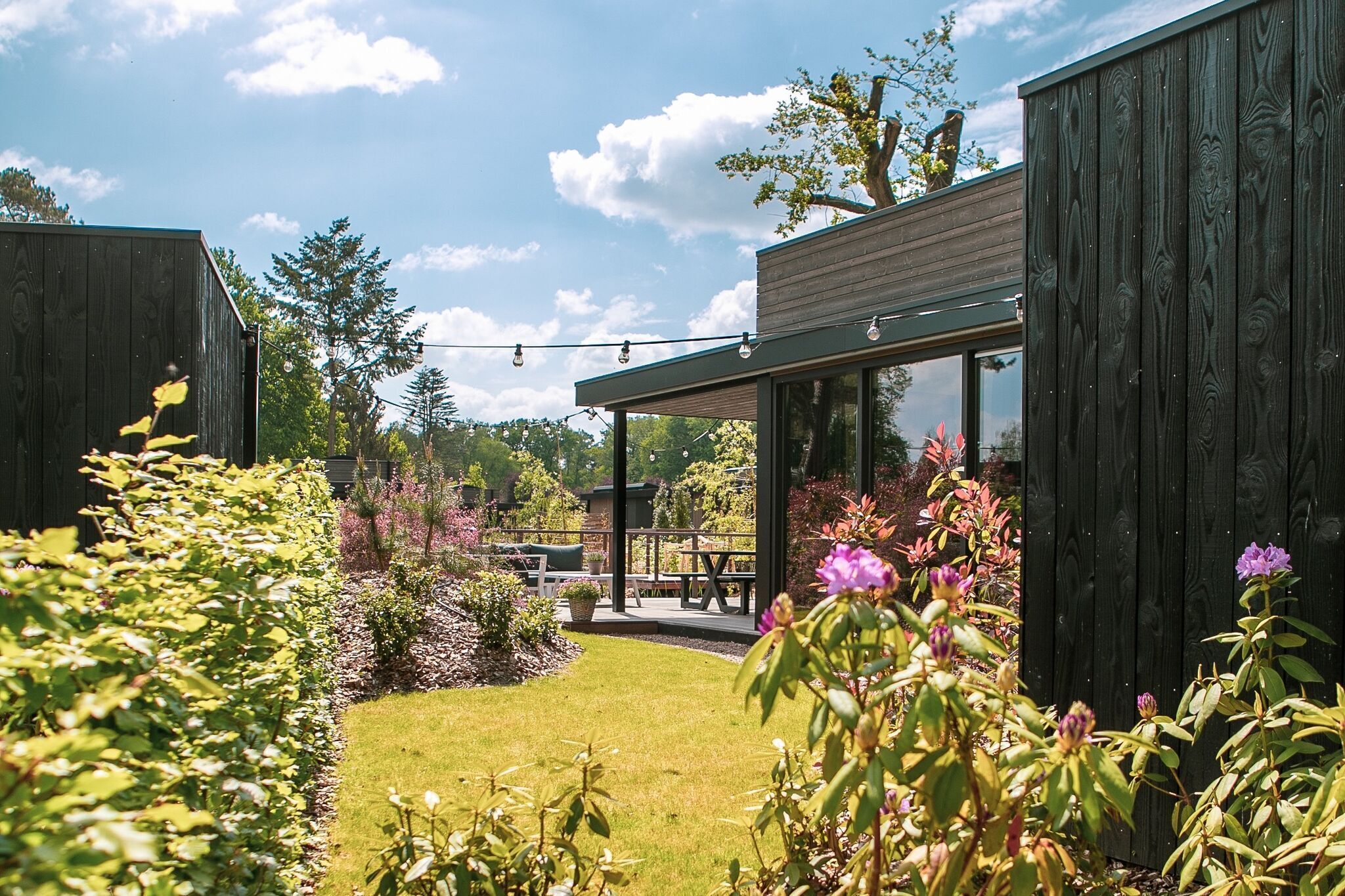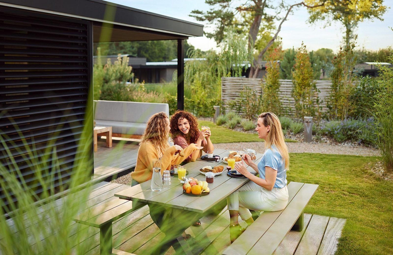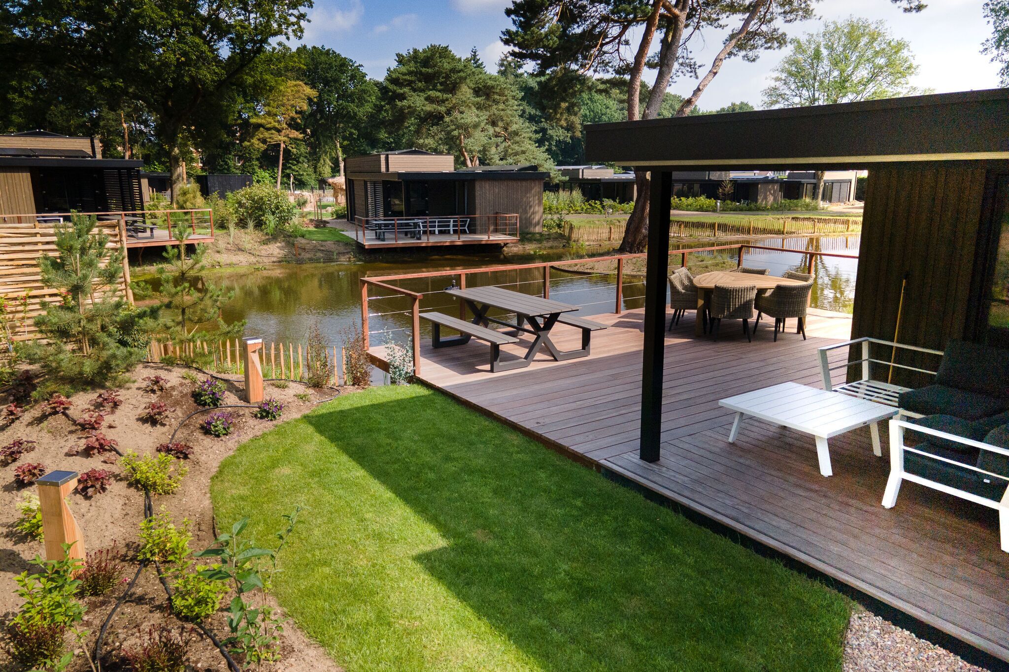 The garden, where you can enjoy the sun all day, has a covered terrace with lounge set. Also, each lodge has a lawn and a terrace with a picnic table. Each lodge has a spacious storage room.