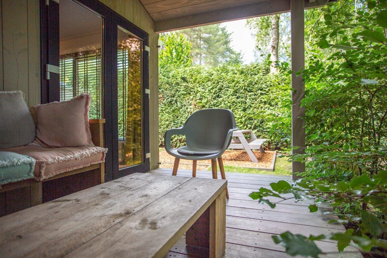 The garden has a covered patio with a lounge set and a lawn with a picnic table. The lodge has a spacious storage area with a washing and drying machine (please note: not every lodge has a washing and drying machine. This is indicated at each lodge individually).