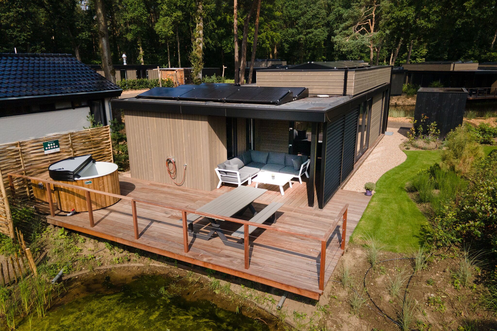 This Luxurious Eco-Lodge, situated at the tranquil pond, is furnished for six persons (recommendation four adults + 2 children due to bunk bed) and has a private hot tub in the enclosed garden. From your own patio, you can relax and enjoy your private wellness moment together or wonderfully alone.