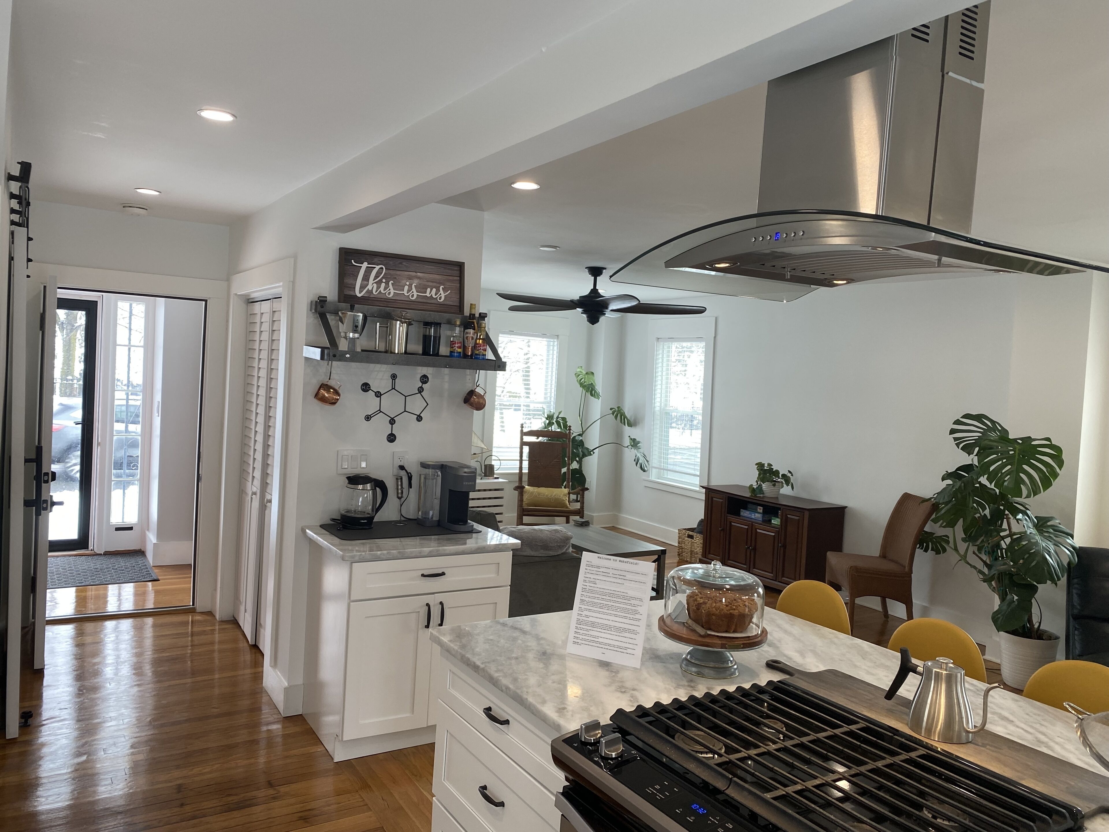 Come home to a view of the lake out of your front windows, the nightly sunset off of your back deck, and an open floor plan that keeps things nice and simple inside. This recently renovated first floor apartment has been designed with great care. Enjoy some modern amenities like stainless steel appliances, hardwood floors, heated bathroom floor, and marble countertops, along with the convenience of in-unit laundry. Join the locals and go for a run around the lake, located across the street, or take a stroll down the street and enjoy the seasonal farmers market, Christmas tree stand, and the ball diamond located at Veteran's Field. Continue on a few minutes farther and dine at the local restaurants, treat yourself at the day spa, and shop at some of the town’s best boutiques. The house is located on the commuter rail train line which can be a little noisy and even rattle the house a bit.Just in case, we provide a white noise machine for any sensitive sleepers! In only a 5 minute walk down the street and a 20 minute train ride into the city, you can be enjoying the sights and sounds of Boston. We offer free fast wifi so that you can stream your own collection of shows and movies at your leisure on your personal device or the Smart TV in the living room. Additionally, we provide a fun collection of books, games, puzzles, and access to the great outdoors :) The owner’s unit of the two-family home is on the second and third floor. This listing is for the first floor unit. Each unit has its own in-unit laundry, separate front and back locked entrances, yard space, and private decks. Non-smokers only. No pets allowed. One off-street parking spot is available for your use.