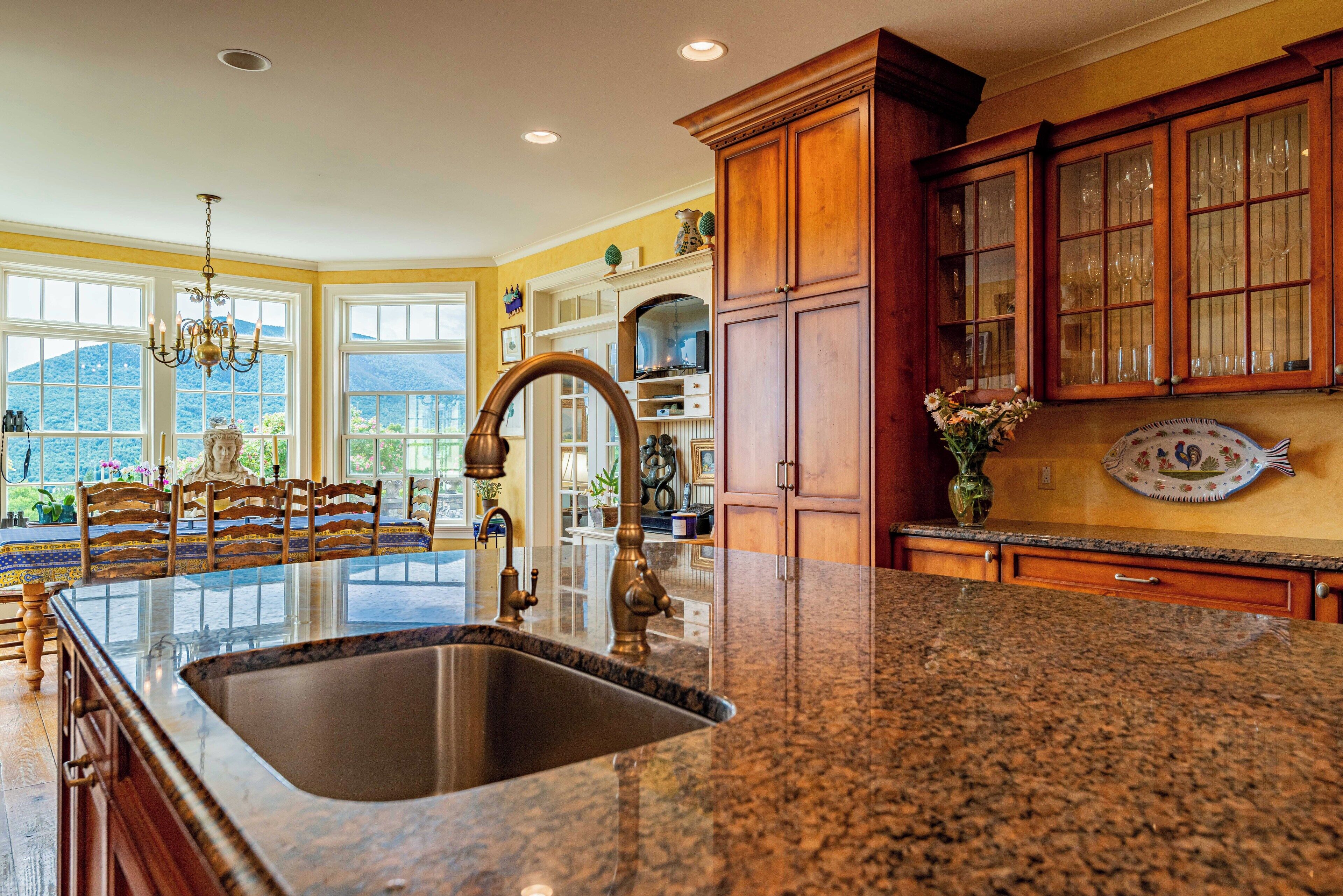 Your cozy, luxurious getaway awaits in Danby at this fabulous, family-owned estate. With 4 bedrooms including 1 king bed and 3 queen beds, guests have plenty of space to relax. The 4 bathrooms are equipped with luxurious amenities-- the master has a large jetted bathtub, a bidet and shower. The dining room is currently configured as a playroom with a TV, sofa and plenty of toys and games for kids of all ages. The house has a fitness area equipped with a Peloton bike, weights, and yoga equipment, and there's even a pickleball court on the property for some outdoor exercise....but you might just find yourself spending the days walking endlessly through the woods and on the beautiful back roads of Danby. The views on the property are extraordinary and the colors during foliage are gorgeous. The Maple, Apple and Birch trees native to Vermont abound and the land has been peppered with a variety of other tree and plant types as well, making it feel like a true arboretum. You can sit on the stone porch at the back of the house overlooking the mountains, large lawn, pond and pool for hours. Build a fire in the fire pit to keep warm in the chillier months. There is such a sense of expanse here, but it's also intimate; you feel cradled by the Green Mountains. You can enjoy the views from the comfort of the bedrooms, or while having breakfast (prepared on the owners' beloved AGA stove) in front of the bay windows in the kitchen. In the winter months, curl up by the fireplace in the living room or study with a great book from Manchester's own Northshire Bookstore (check out Northshire's www.bookcurator.com program, if you want a curated selection of books delivered to you here before your arrival). The property is 20 minutes from the wonderful town of Manchester (Orvis, Ben & Jerry's, Northshire Bookstore, Southern Vermont Art Center, Outlet Stores), and just 15 minutes from Dorset (Dorset Theatre, Dorset Union Store, Barrows House, Dorset Inn). It is centrally located between Stratton, Okemo, Bromley, Killington and Pico mountains, so if you like to ski, snowboard or enjoy summer hiking and biking, this is the perfect location for you.