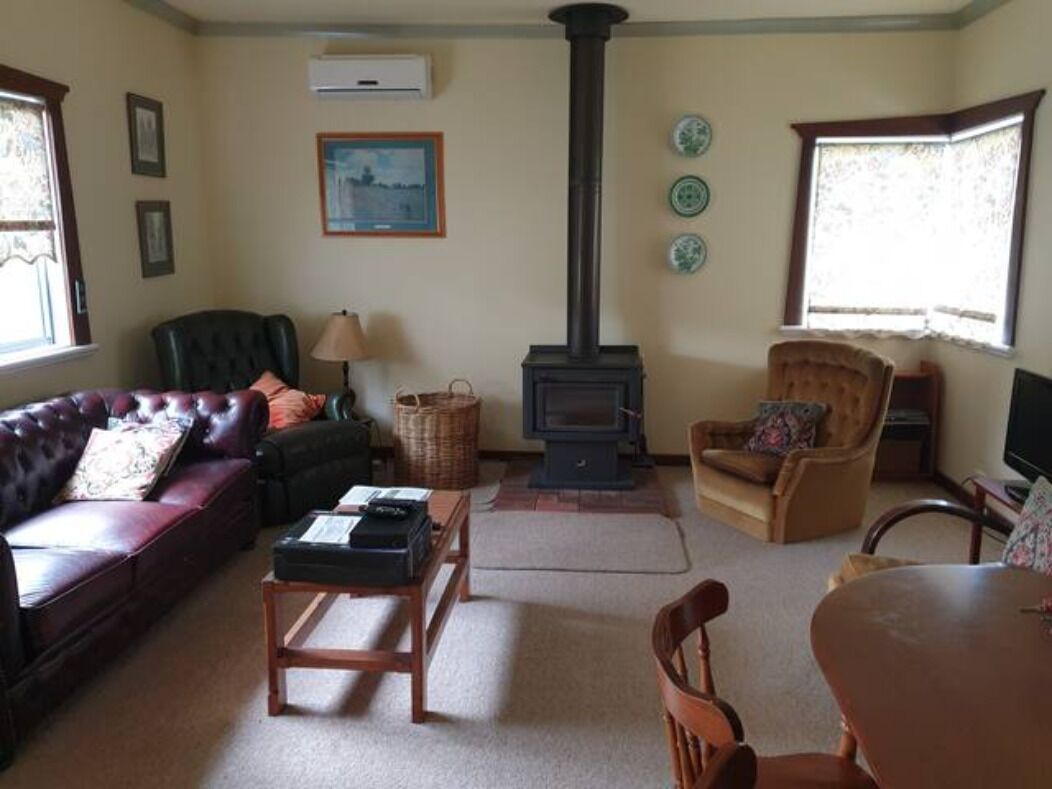 The house is self-catering, and the kitchen is very well-equipped. The house has a vintage bathroom – with a good-sized soaking bath and shower combination. Books, board games, a cosy wood fire, a reverse cycle AC, and a TV. All three bedrooms are roomy. The house has a quaint front verandah, a large rear patio and a secure backyard with ample uncovered parking.
