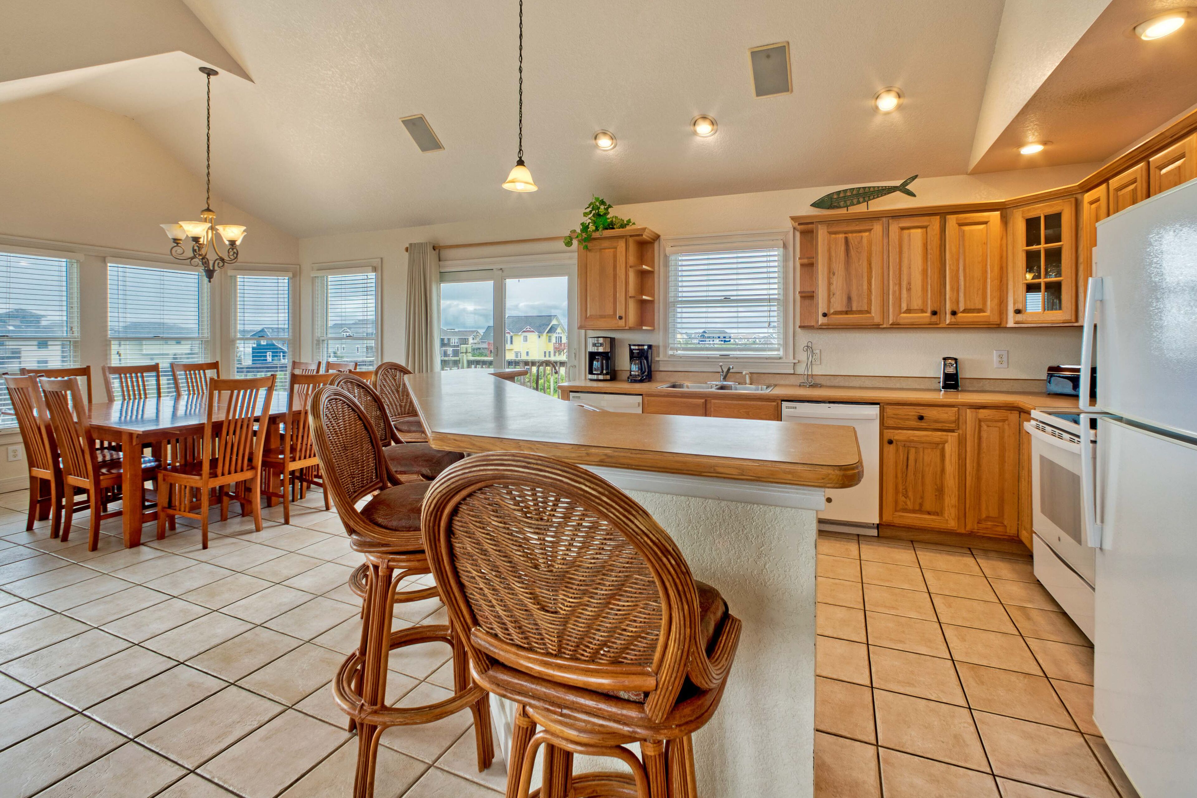 Cook together in the fully stocked chef’s kitchen, featuring new GE appliances with built-in air fryers, Keurig + electric kettle, blender, bakeware, and more. Between the large dining table, kitchen island, and upper deck, all 14 guests can dine together with ocean views.