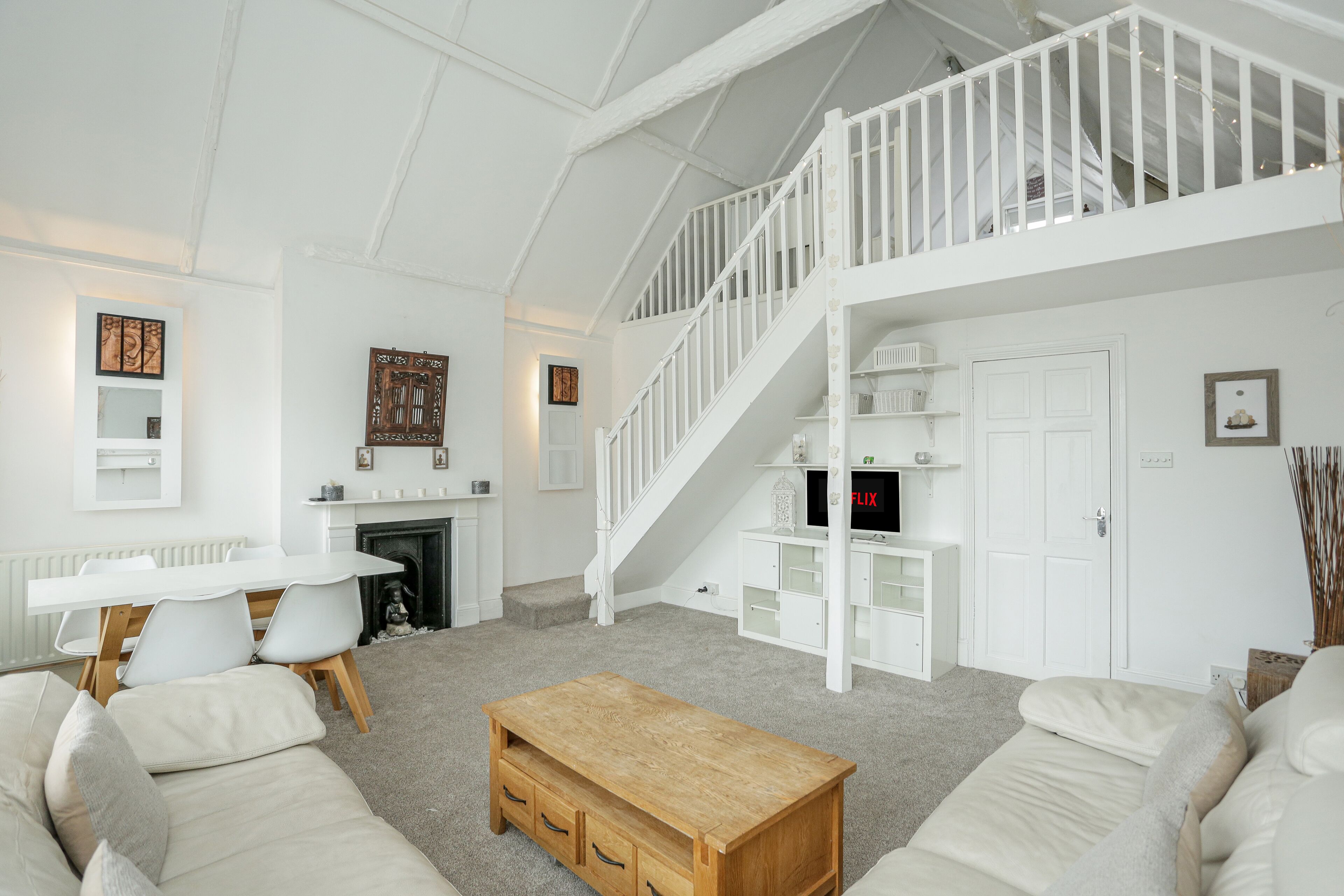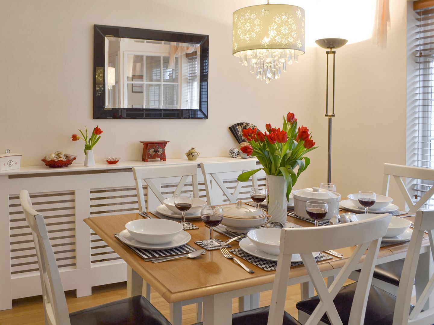 The front reception room is beautifully decorated with Laura Ashley wallpaper and has an original working open fireplace. Large bay sash windows look out into the front garden. Featuring a large corner sofa and additional two-seater sofa there is ample space for up to 8 guests. Smart TV with Netflix, Amazon Prime and FreeSat. There is also a large toy chest with plenty of games and activities for little ones.