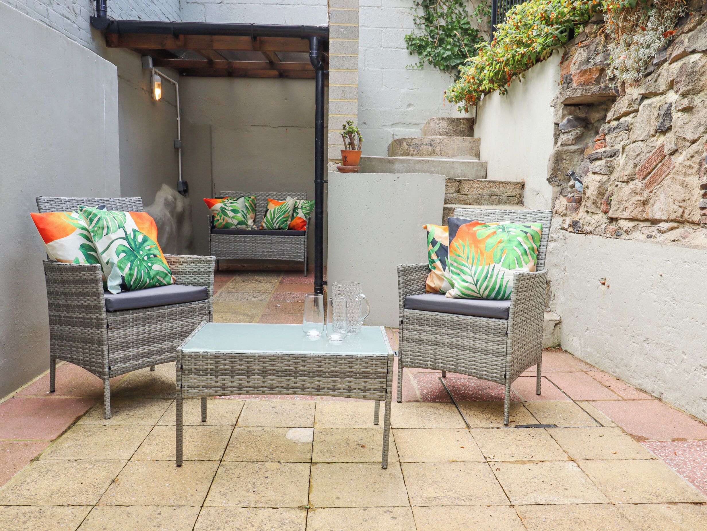 Outdoors: Enclosed rear paved garden, table and chairs and a secure rear gate