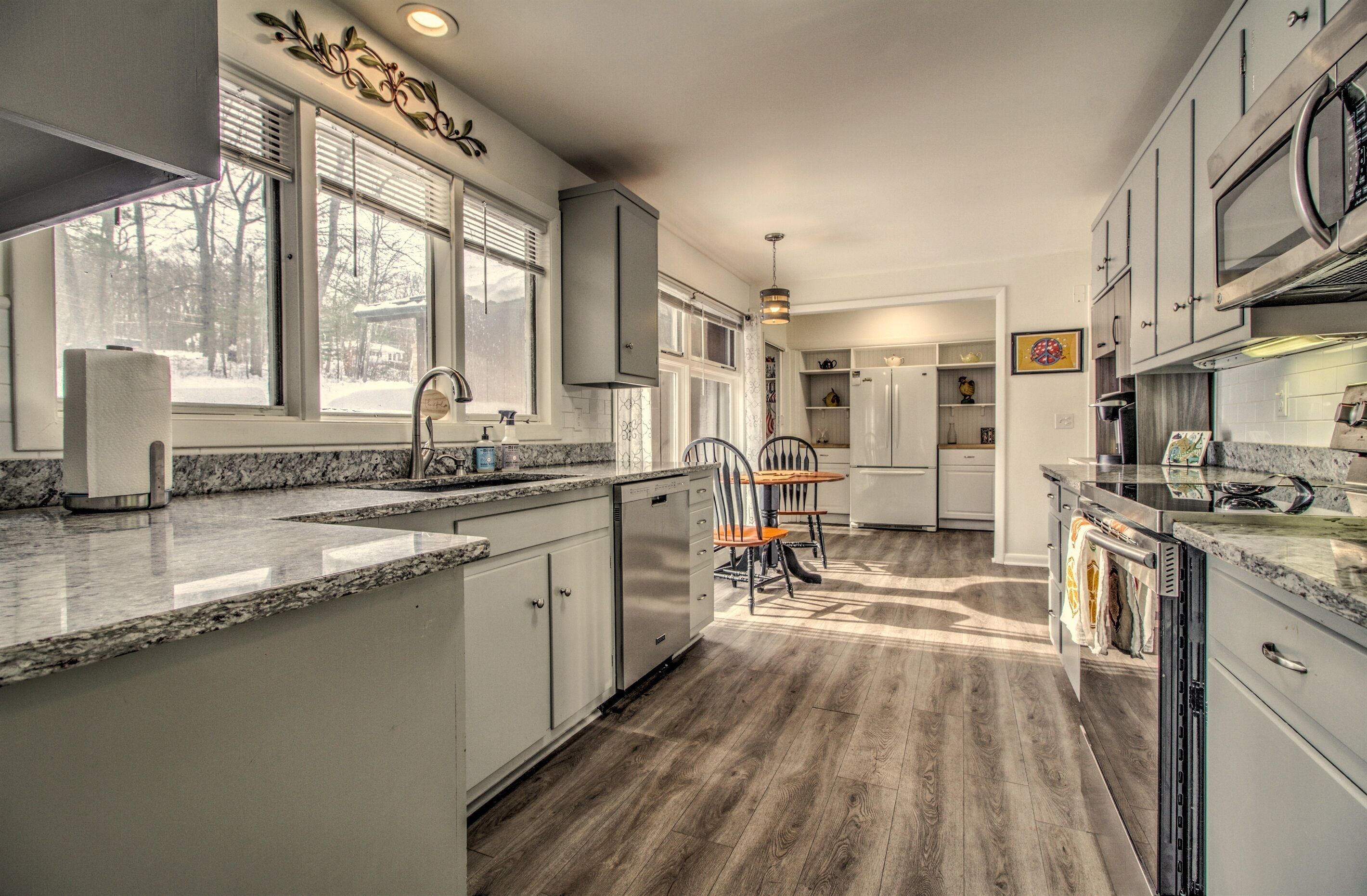 The downstairs of our home features an open concept, where guests can eat at the kitchen table, sit on stools at the large soapstone peninsula, or migrate to the dining area with drinks with family or friends.