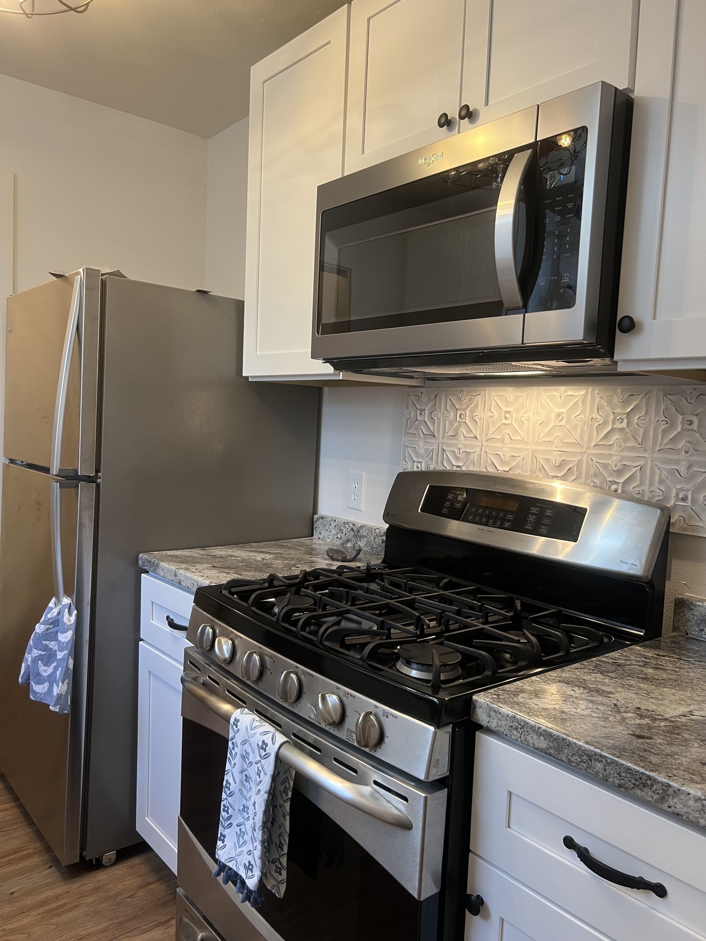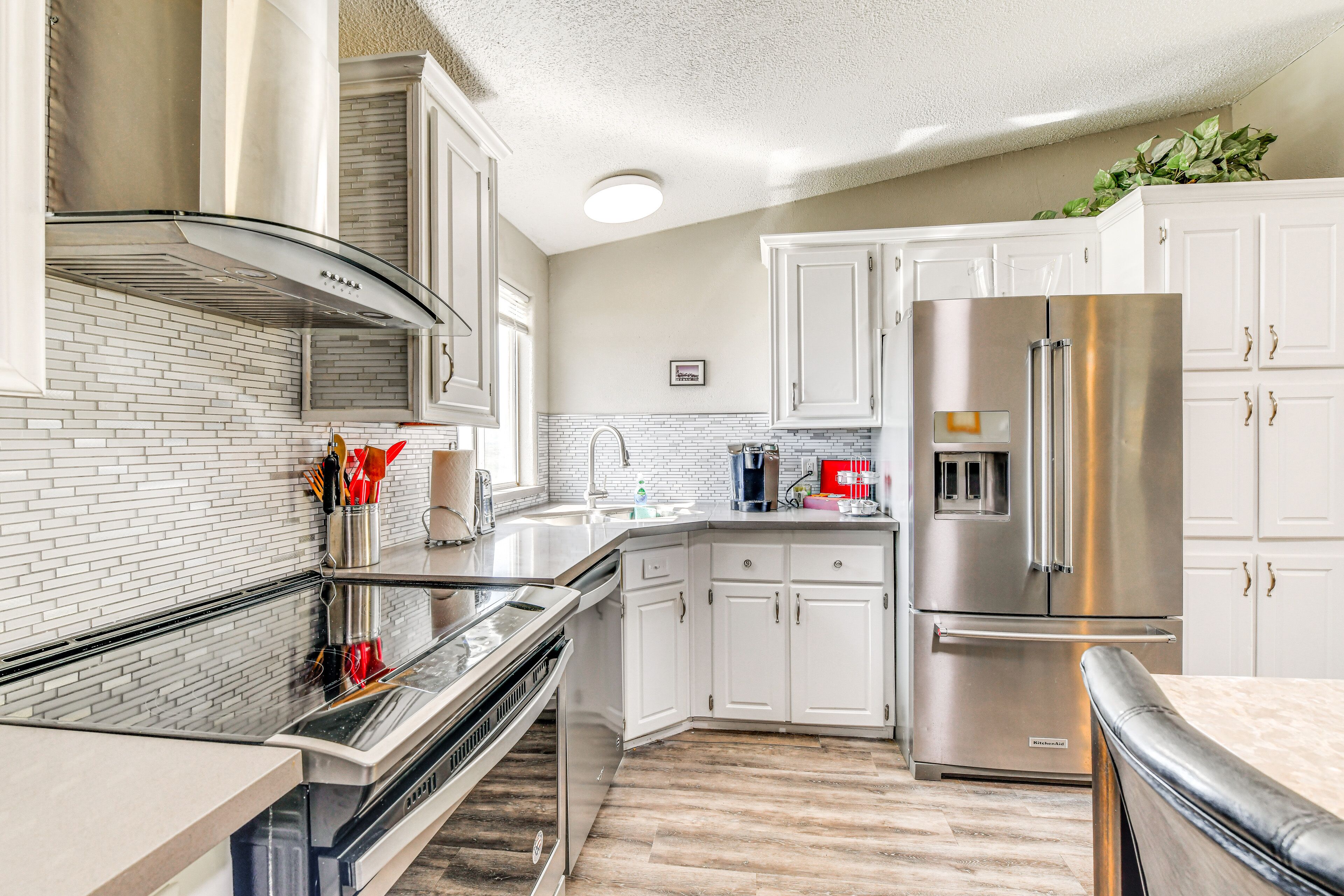 KITCHEN: Stove/oven, refrigerator, microwave, dishwasher, Keurig coffee maker, kettle, toaster, dining table w/ chairs, breakfast bar w/ stools, dishware & flatware, paper towels, trash bags
