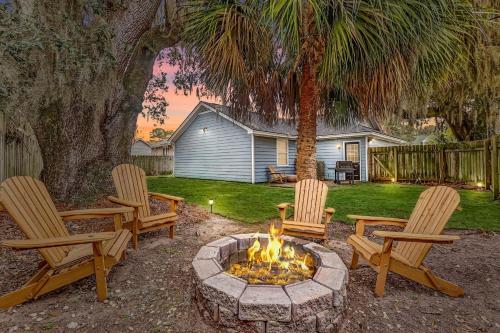 In between the dining room and the kitchen is a door that leads out to the garage. Inside the garage you will find a ping pong table and corn hole setup. The Wilmington Island weather almost always calls for corn hole! At the back of the garage, you will find a door that leads out to the patio where a charcoal BBQ grill can be found. Guests are responsible for bringing their own charcoal as well as cleaning off the grill if you decide to use it. Please be courteous to the next family that might want to use it! Past the patio, the backyard has been set up with Adirondack chairs around the firepit. Please note, use of the firepit in a safe and controlled manner is fully incumbent on the guest. Use of the fire pit is acknowledgement that the guest knows how to and will operate the firepit in a safe and deliberate manner. If you do not know how to use a fire pit safely, please don’t do so!