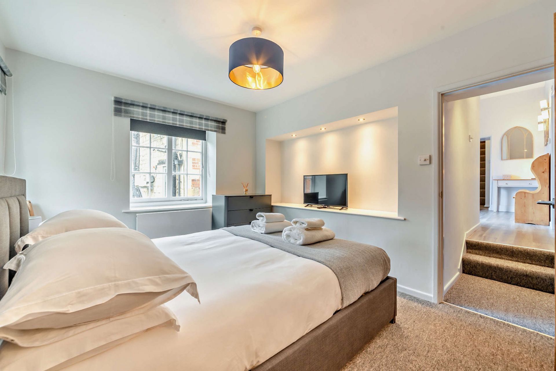 This fresh and bright dual-aspect double bedroom overlooks the front of the house and the garden and is furnished with a standard double bed with bedside tables and reading lamps. It has a walk-in wardrobe and a cupboard with shelves, a wall-mounted TV, a full-length mirror and a make-up mirror on the windowsill overlooking the garden.