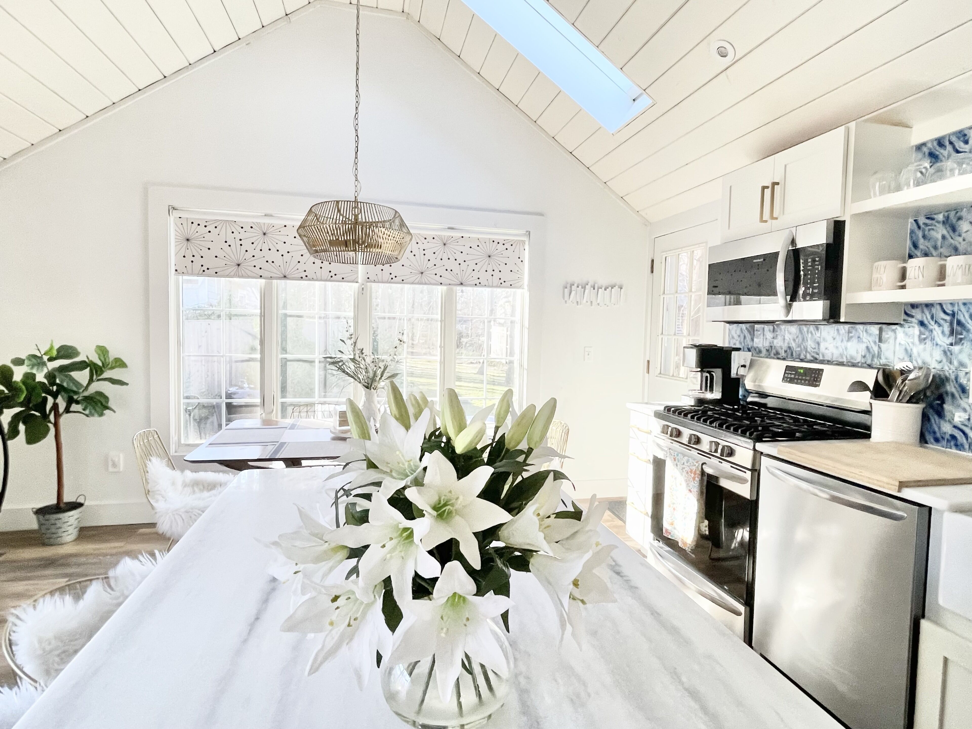 The living spaces in this home offer a perfect blend of comfort and style, with hardwood and tile floors throughout. The inviting living room features a queen pullout couch, a loveseat, and a flat-screen Smart TV mounted above the gas fireplace, creating a warm and relaxing atmosphere. The home has been completely refreshed with new paint, refinished floors, updated light fixtures, and recessed lighting, enhancing its bright and modern feel.