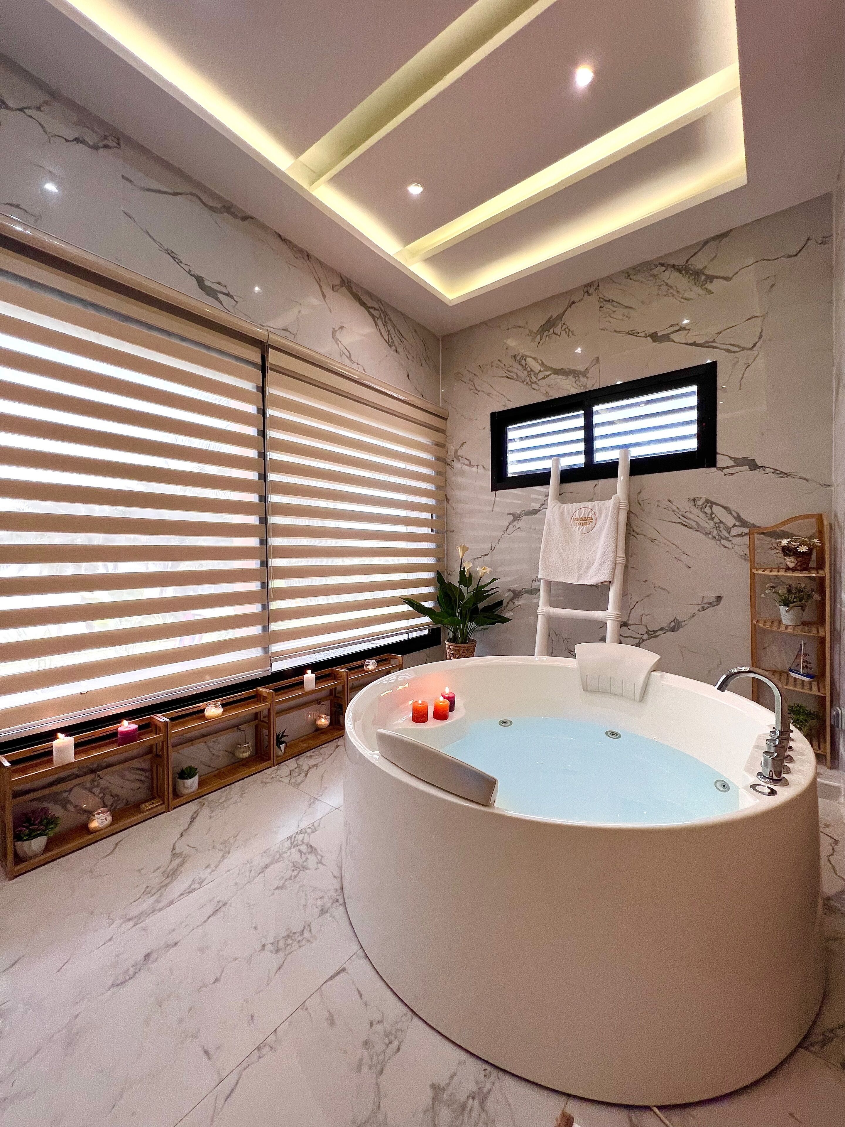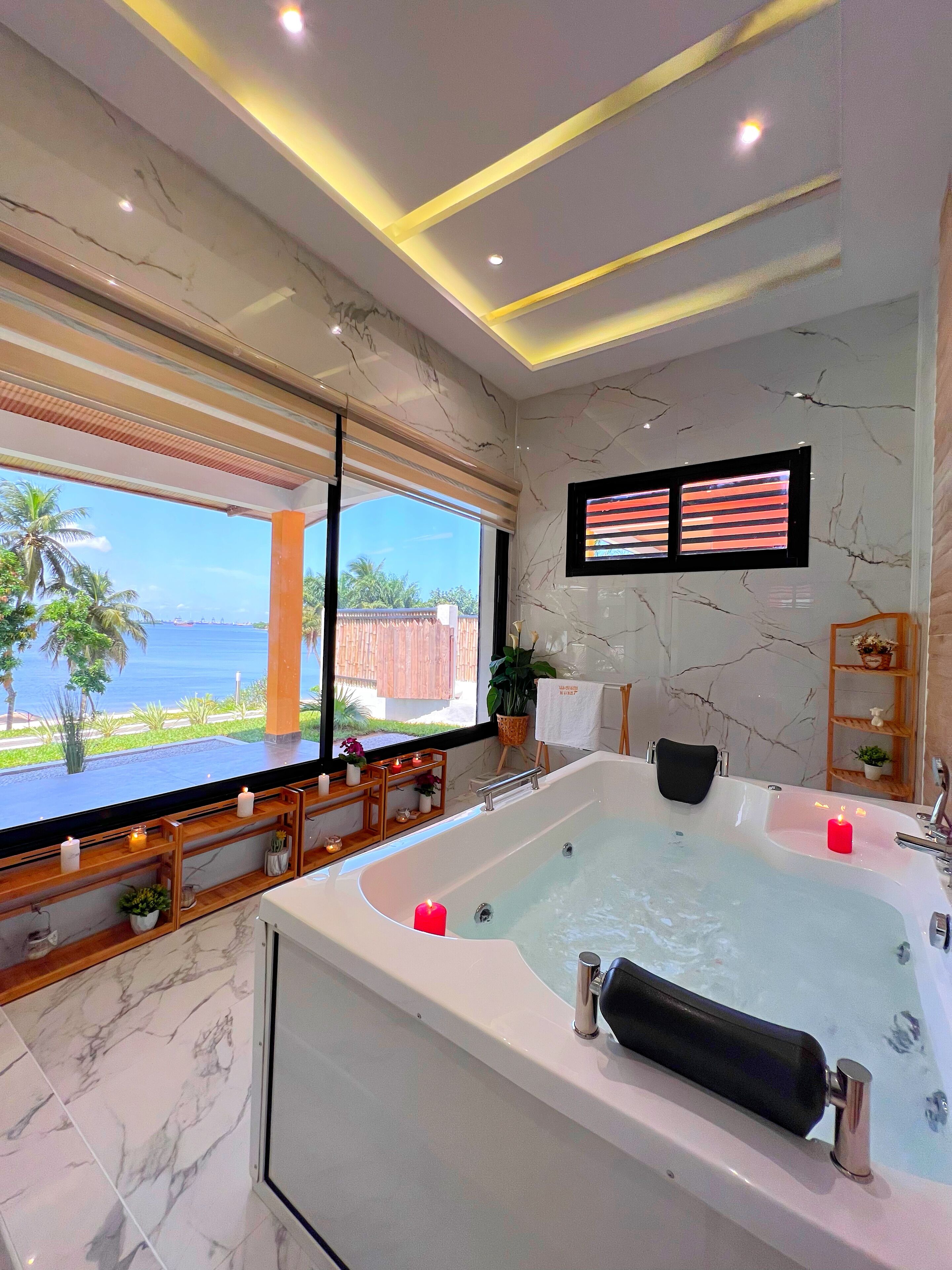 This magnificent villa includes a spacious bedroom, a large living room, a private pool, and a jacuzzi room with stunning views of the lagoon.