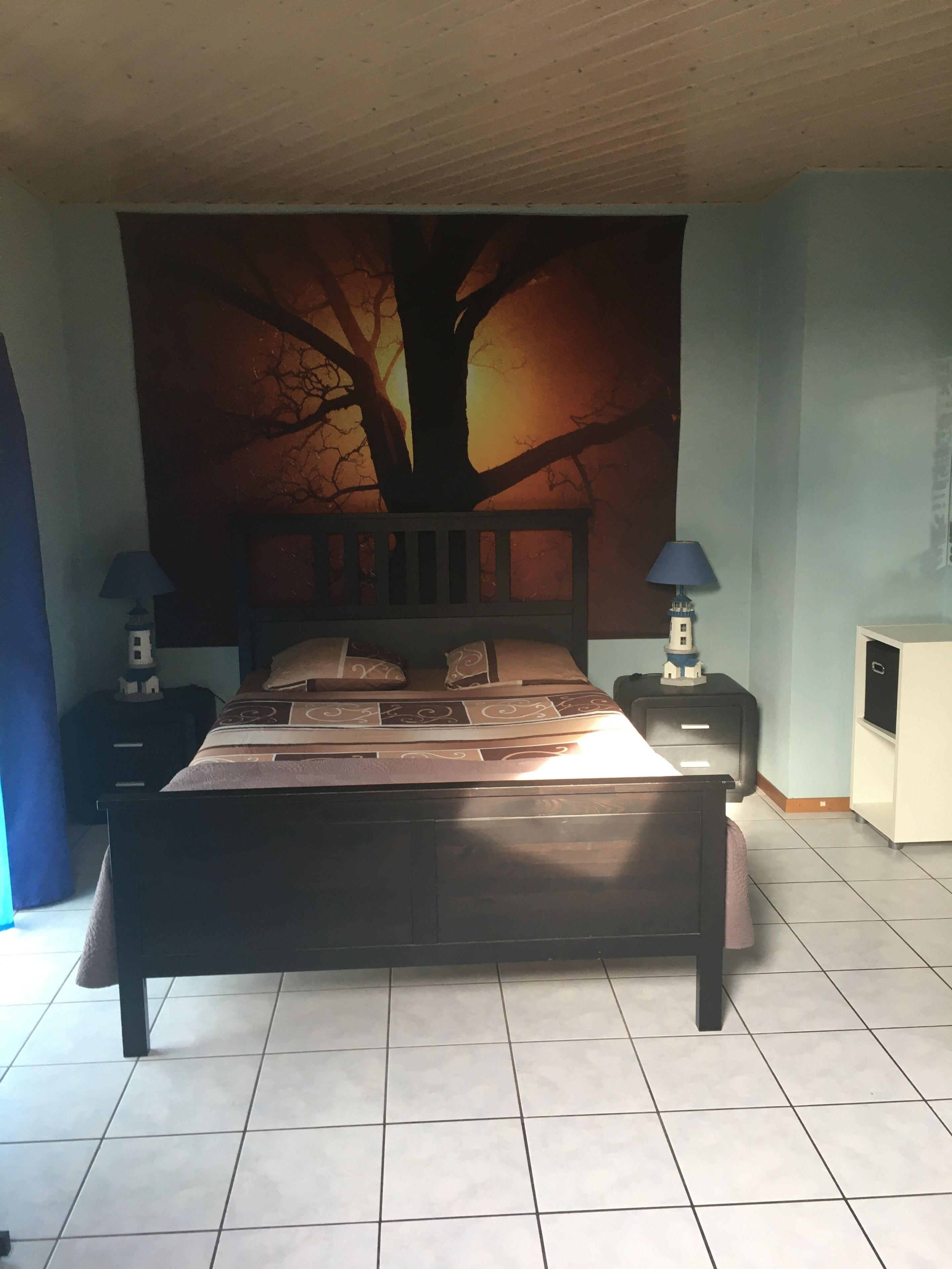 je vous propose une chambre équipée , télévision , divan relax chaise bureau bureau ,grande armoire lit double
