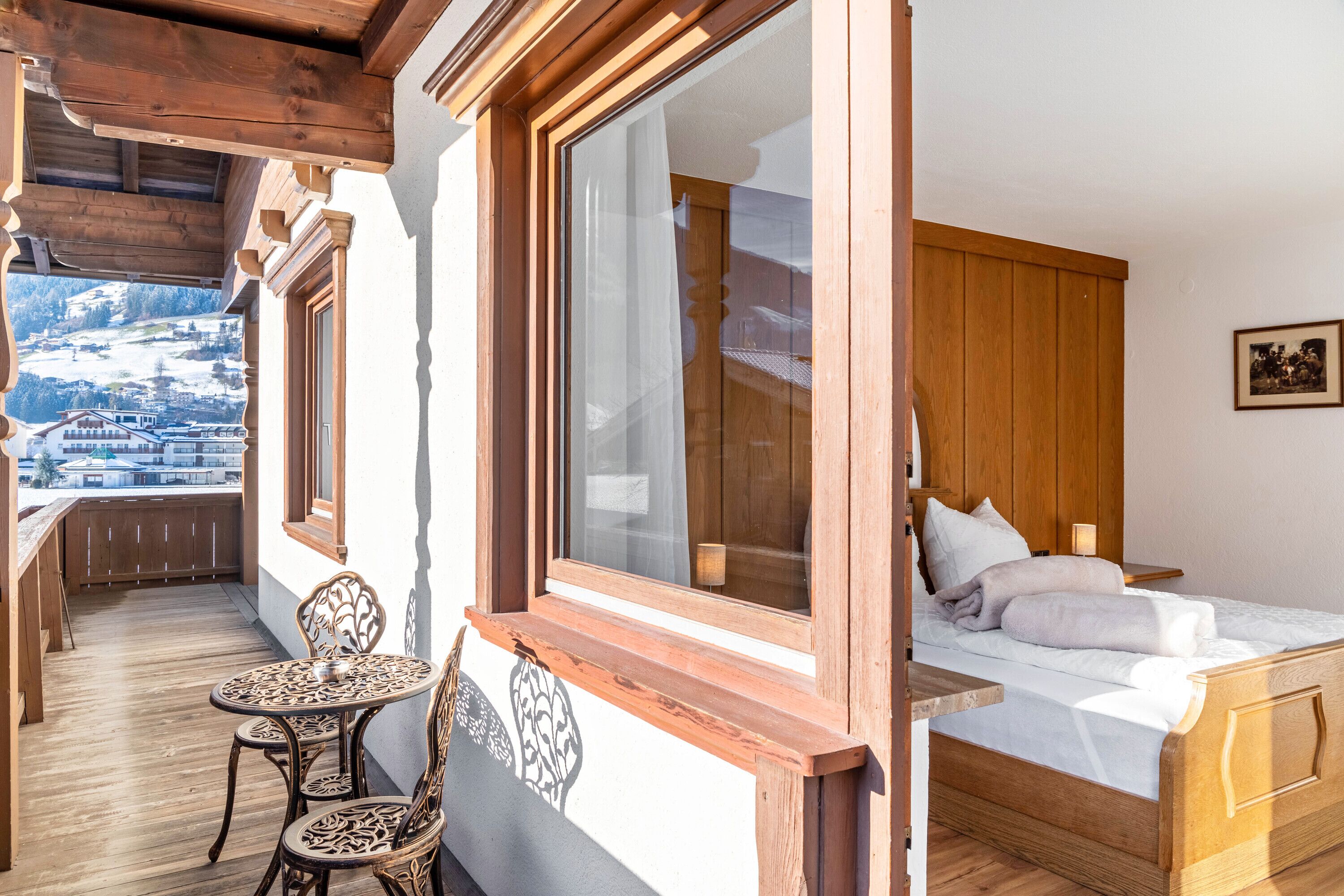 The flat has a private balcony from which you can enjoy a panoramic view of the mountains. There is plenty of space to sit together in the cosy Tyrolean-style lounge area.