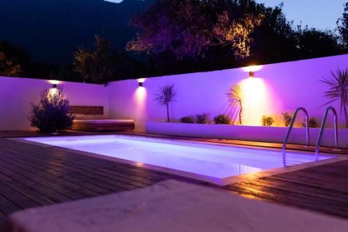 The pool (30m2) and children's pool (8m2) have a mountain view. It has air conditioning, a terrace, outdoor kitchen and barbecue. Private parking, free WiFi, Netflix and Tivibu are also available.
