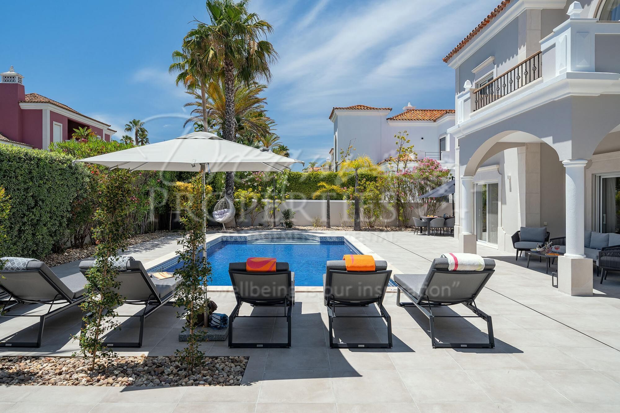 The large patio at the back of the villa is surrounded by green foliage and is perfect for Al-Fresco dining, with a dining table and sunloungers for relaxing. The private pool can be heated, and a safety gate can be installed on request **.