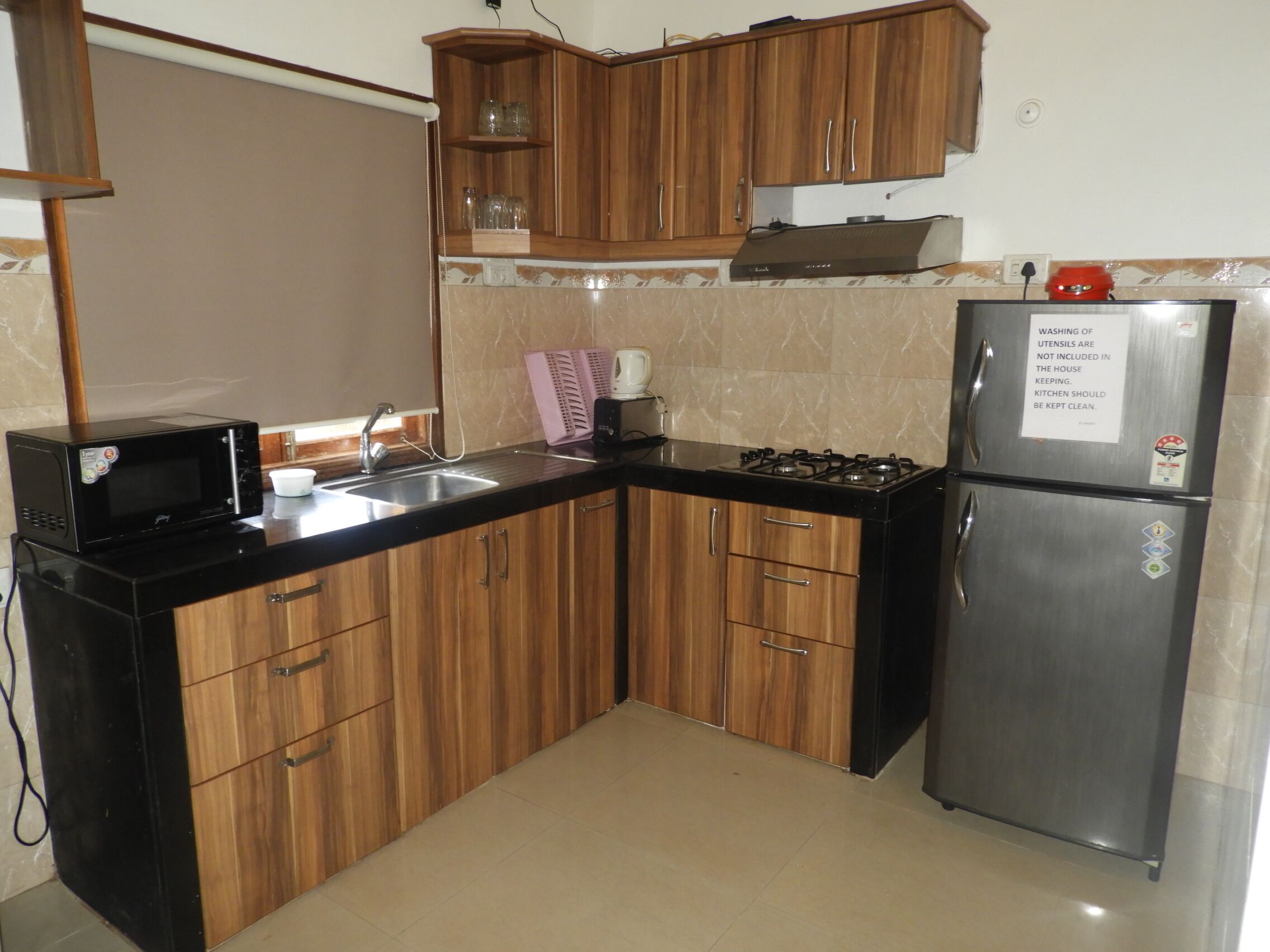 - It is equipped with a refrigerator, a microwave oven, an induction plate with cookware, a gas stove and a water purifier and other basic equipment.
