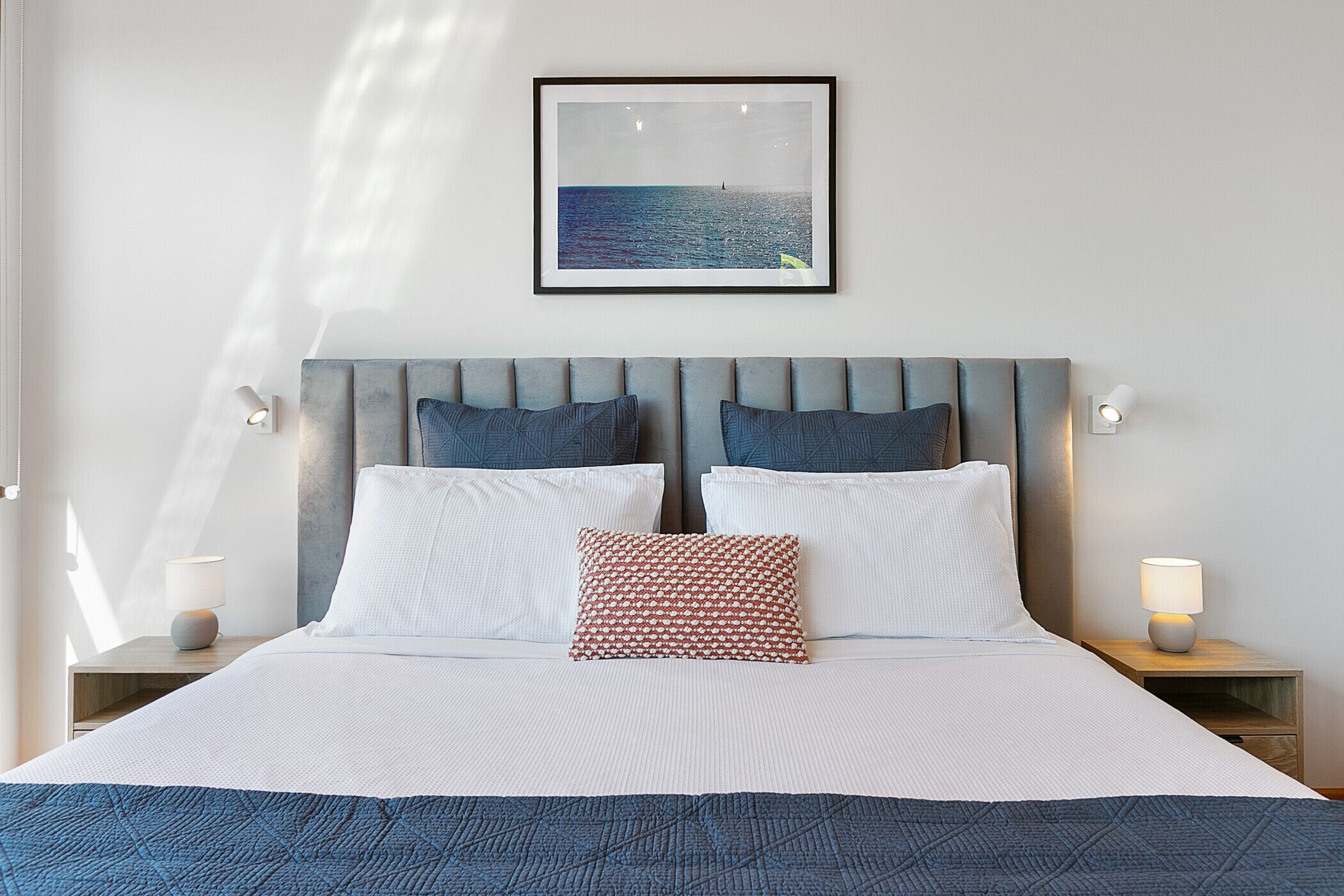 Master bedroom is bright and airy, with queen bed, portable electric heating, 2 bedside lamps and cabinets, doona & carpet flooring. You can see the ocean from your large bedroom window.