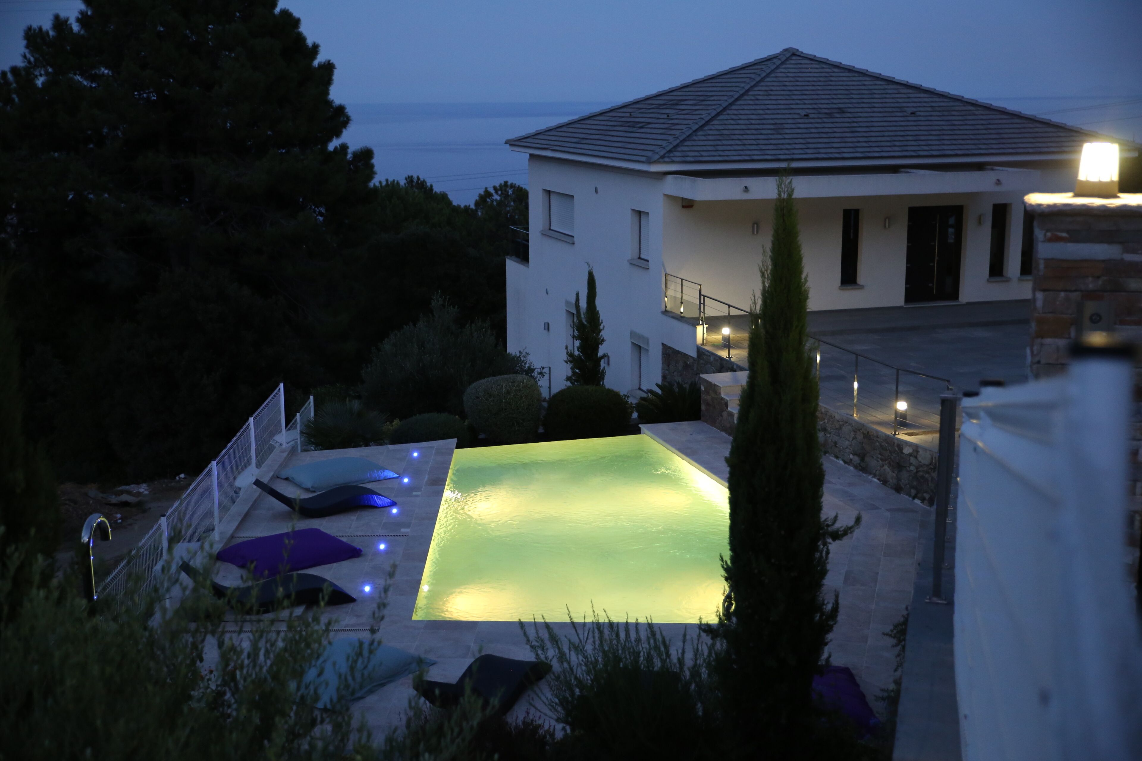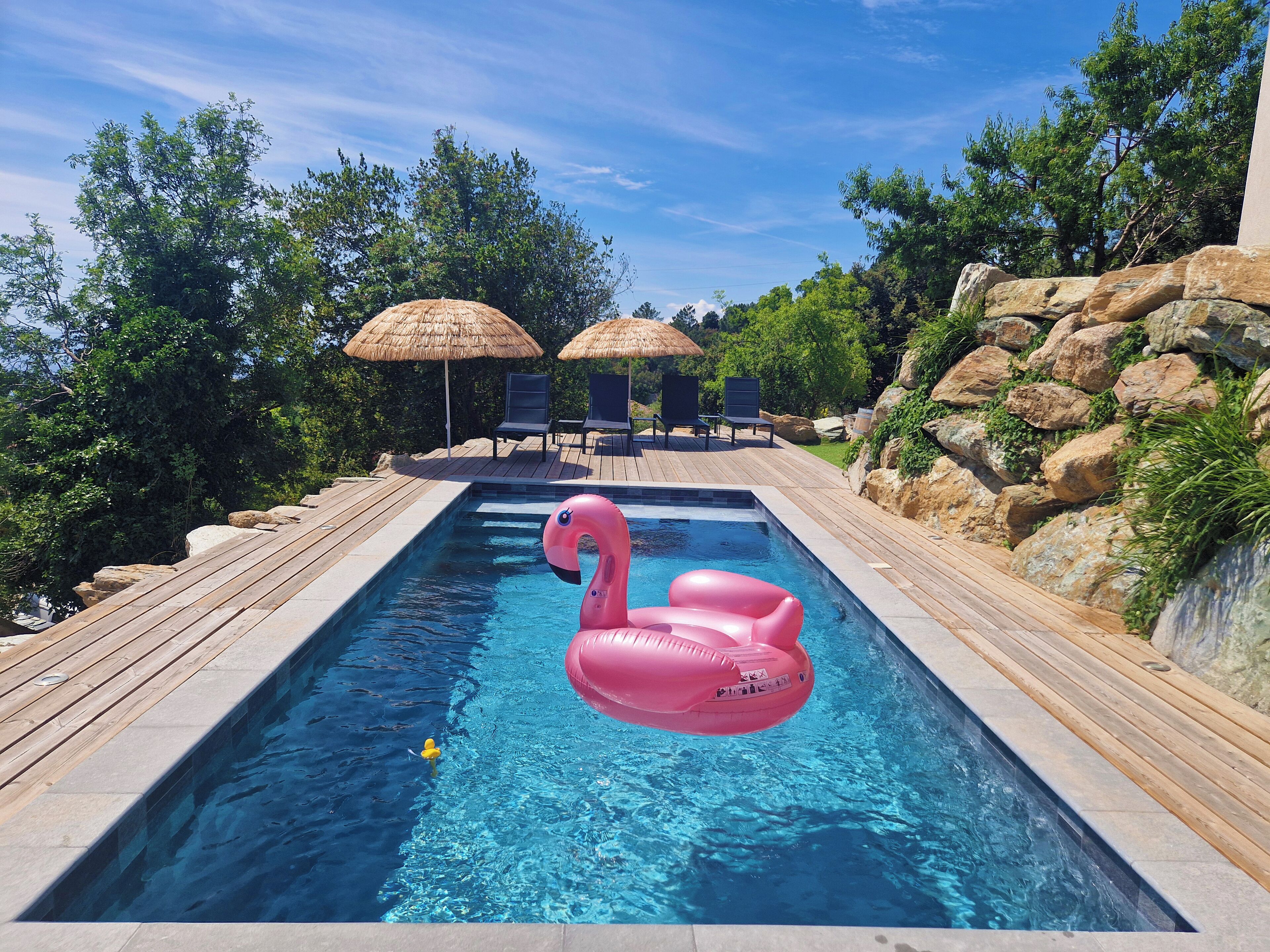 Between sea and mountain, on the heights of Bastia, enjoying a panoramic view, our villa welcomes you in its green setting. A fully enclosed garden of 1500m2 where you will find the local flora composed of olive trees, arbutus trees and hundred-year-old heather. ..Children will enjoy a porch, swings, a badminton net while parents will indulge in lazing around on the deckchairs after a day exploring our Isle of Beauty.