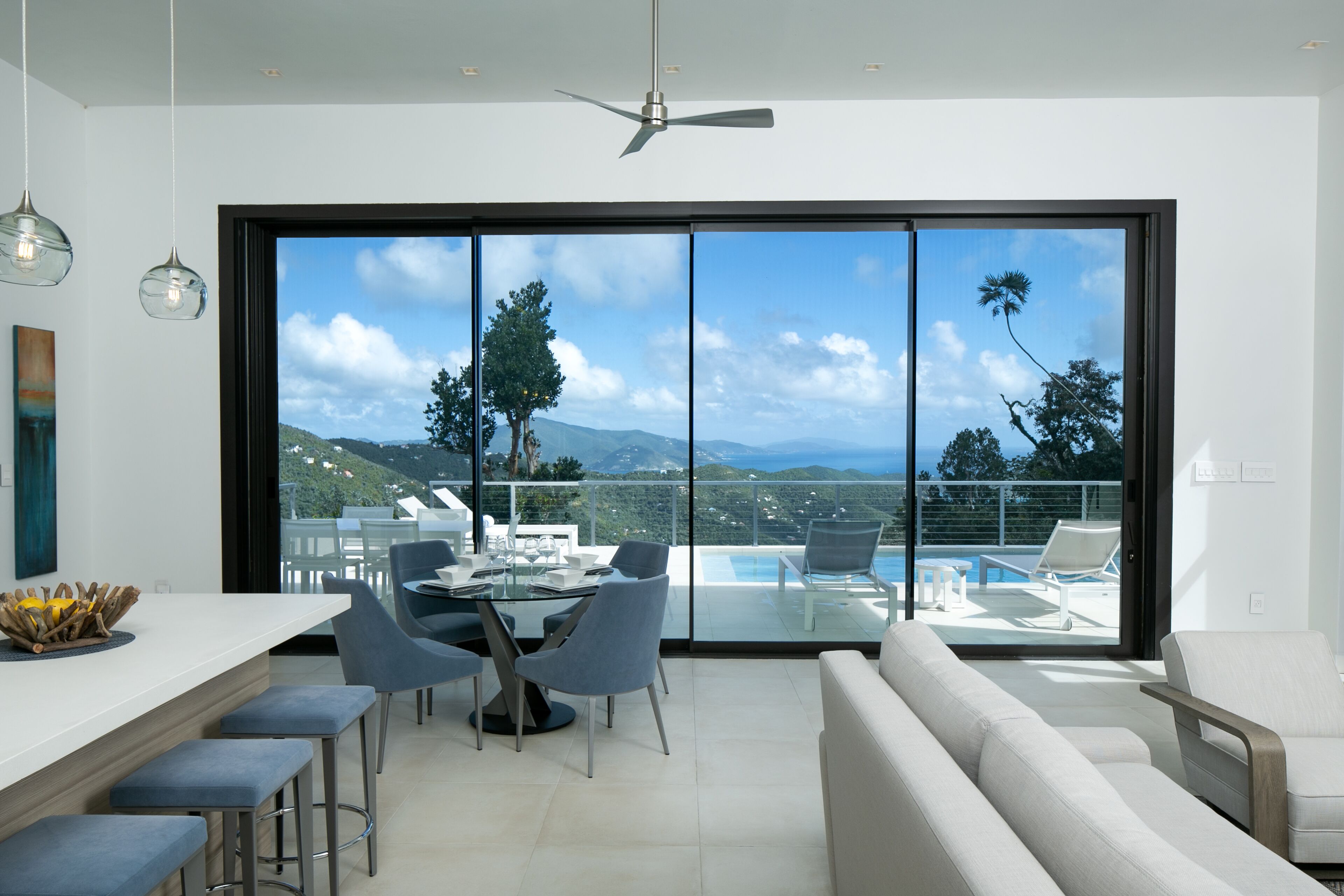 Trio of glass sliders opening onto covered patio with view of the valley sweeping into Coral Bay allowing you to enjoy the Caribbean scene and lush gardens from inside or out.