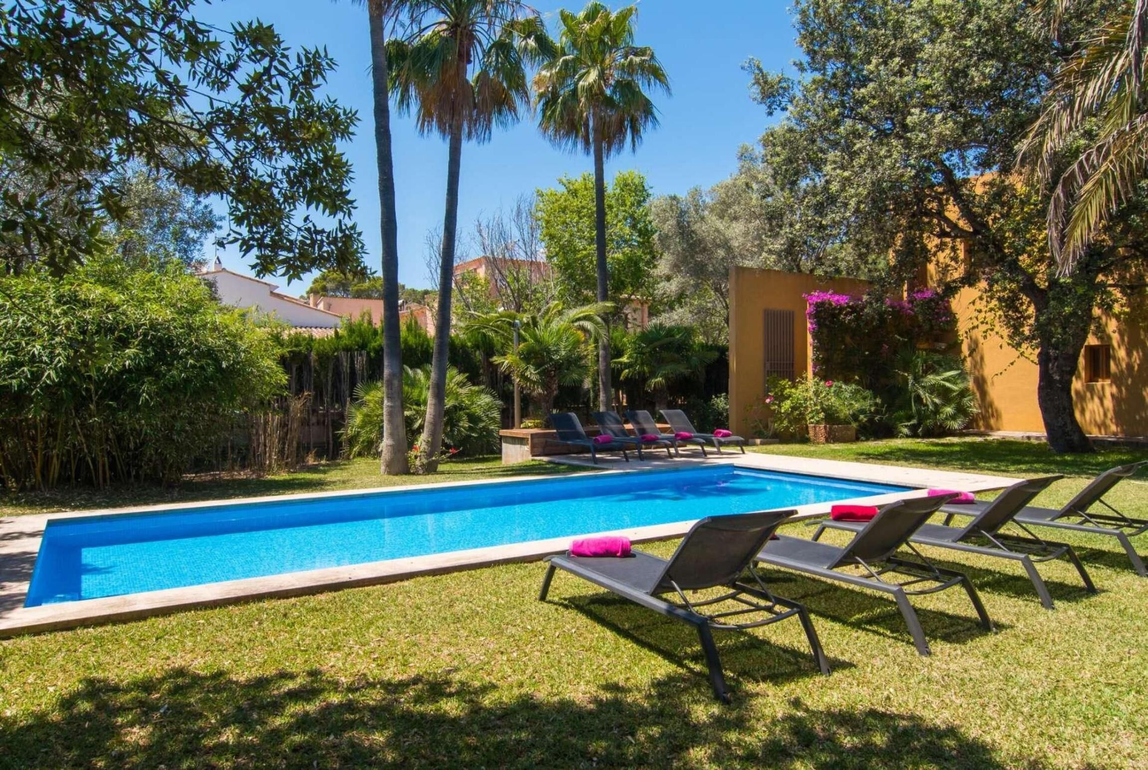 With its architectural individuality, an oasis-like garden, and an absolutely gorgeous interior, the sunny yellow villa "Son Floriana" is dressed to impress. The architect/owner of this aesthetically pleasing estate has succeeded in perfectly translating his impressive ideas into reality. The L-shaped building is ideal for travelers who prefer a certain autonomy, but still like going places on foot. The fact that the south-facing house is located in a residential area does not intrude, as the outdoor area with its heavenly garden and large pool is not overlooked. The huge garden, full of tall palms and lush Mediterranean vegetation is set on two different levels. On the first is the spacious pool with sun terrace and broad lawn. On the second level, nestled peacefully beneath a bamboo canopy and with the shade of surrounding trees, is a fish pond. An island of relaxation for its grown-up guests, this is also a great place for little ones to play. There are numerous seats scattered across the grounds: choose from the casual seating under the rush "toldo" or canopy, the sweet little spot in the shade of the palms, or the dining area on the covered veranda. Even if you have several people in your group, everyone will find their own favourite spot to relax and chill.