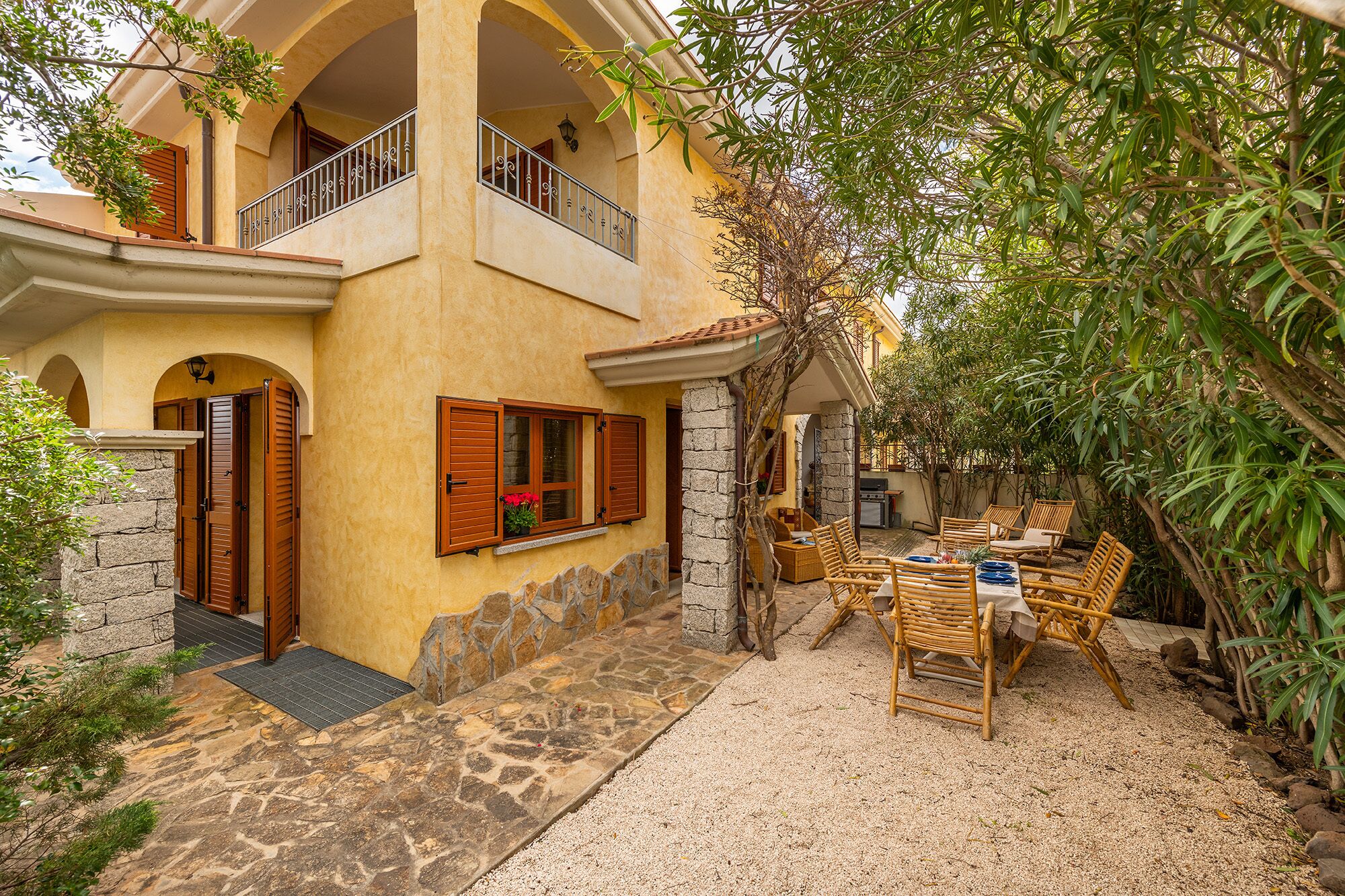 The entire villa has a large patio equipped with table and chairs for outdoor dining all connected to a charming garden featuring typical Mediterranean plants.