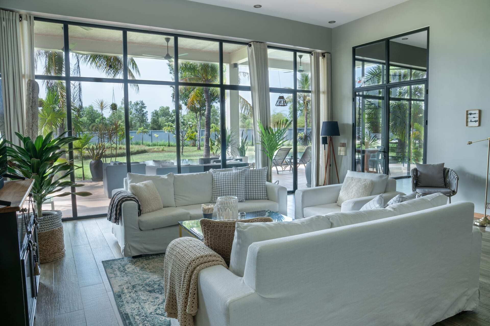 The modern house sits at the end of a beautiful garden with a diversity and richness one can expect in a tropical setting. There's little disruption of the landscape with the