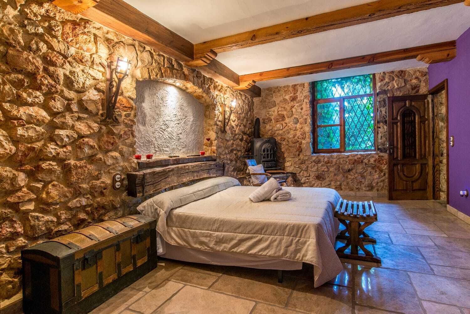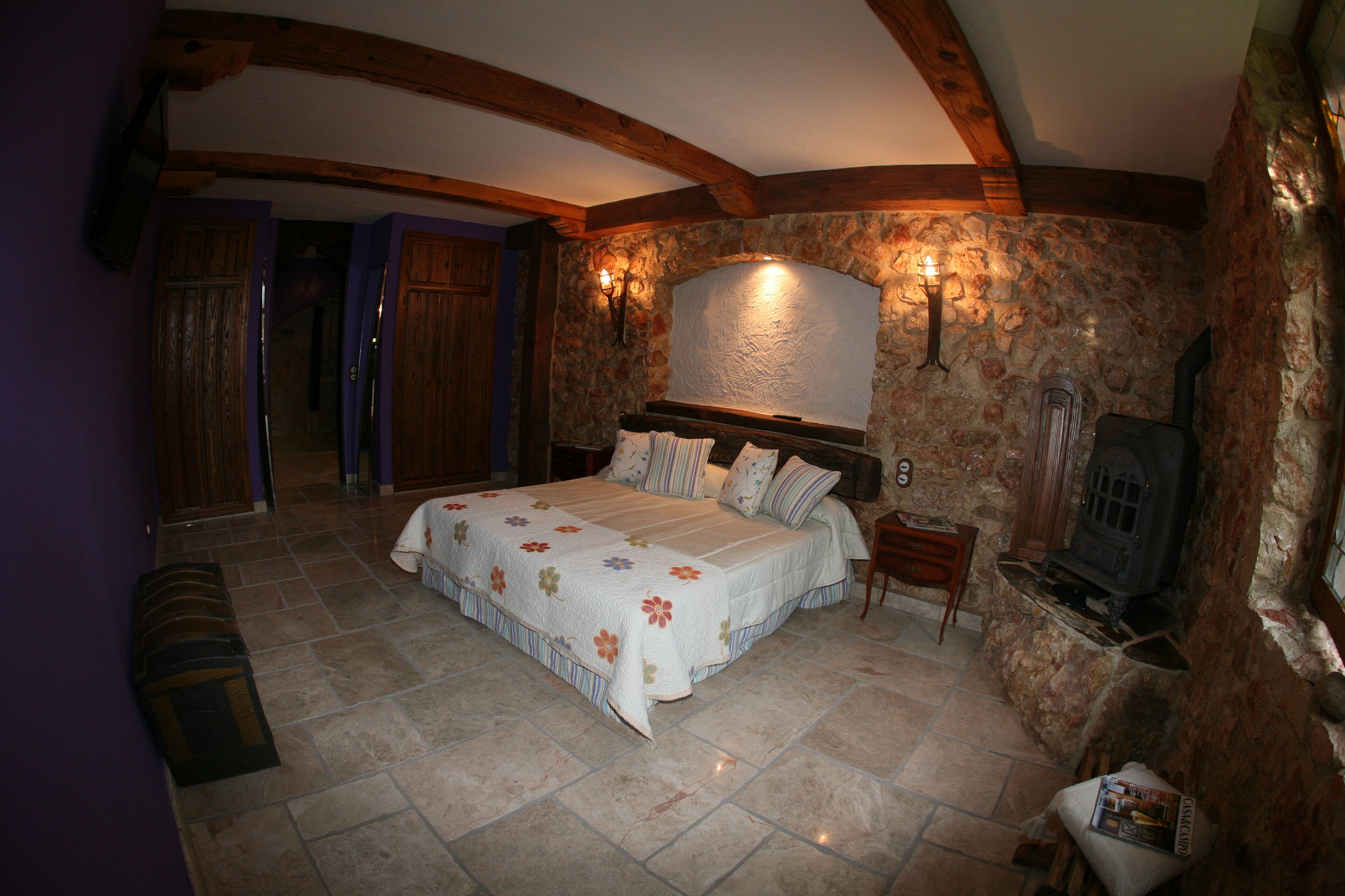 - Living room: with fireplace and natural cave. Wooden beams. 57-inch television