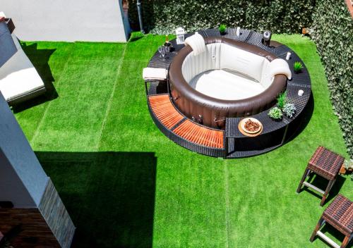 The exterior is also furnished with a table and chairs, a BBQ, sofas and a chaise longue for outdoor use.