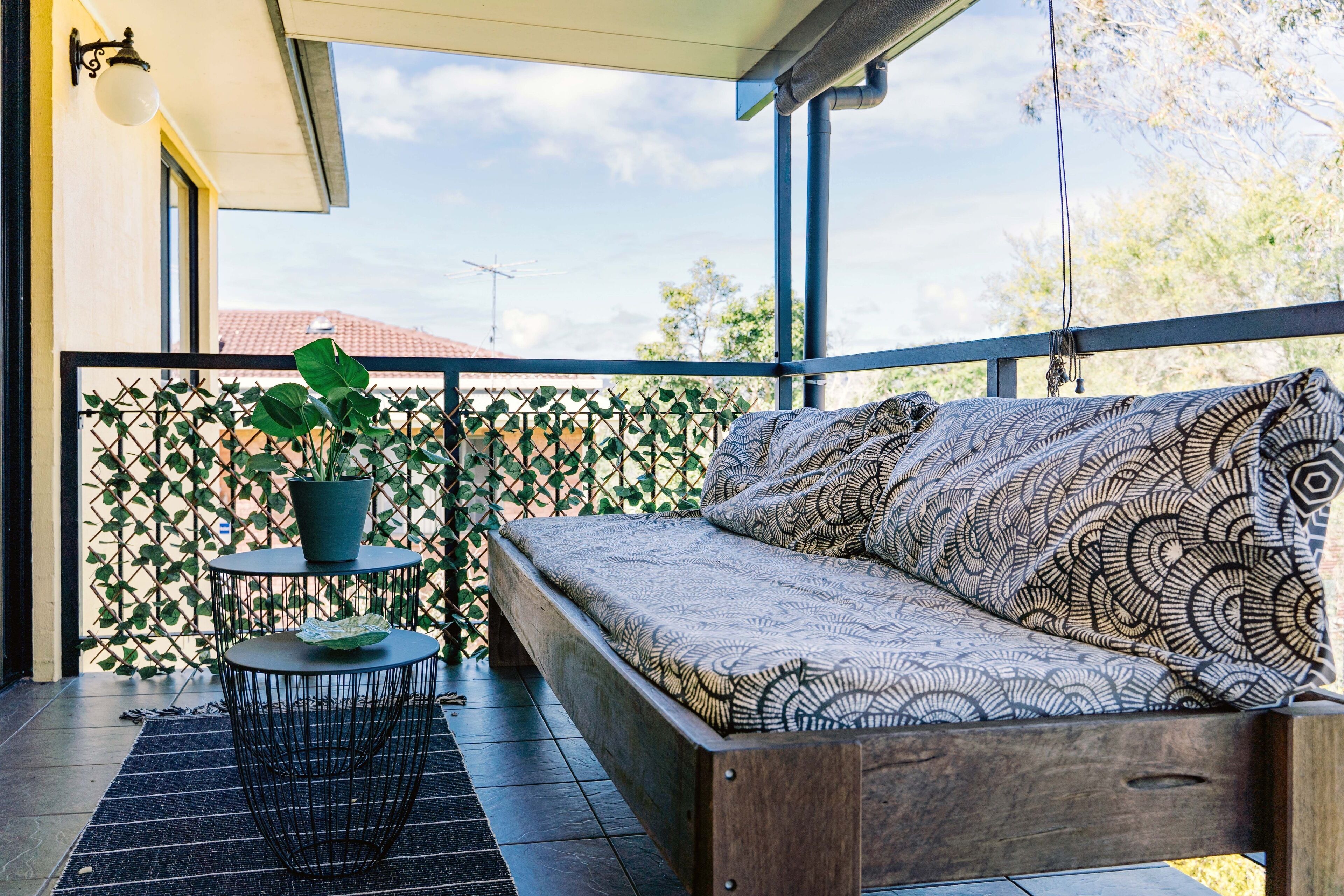 The open-plan living area boasts a fully equipped galley kitchen with suspended concrete benches and custom cabinetry, alongside a striking Norfolk pine dining table. Lounge in style on the antique cane daybed, adorned with a hand-woven wool rug, or step outside onto the expansive north-facing deck. Surrounded by a lush tropical oasis alive with vibrant birdlife, the deck is a haven of serenity, featuring a luxurious Brazilian double hammock—perfect for soaking up the sunshine or swaying gently to the ocean breeze.