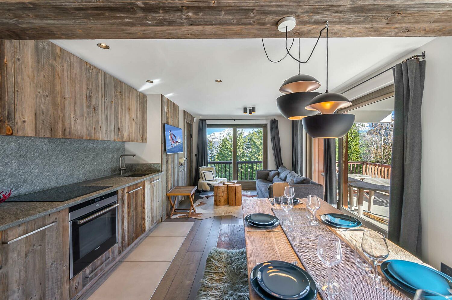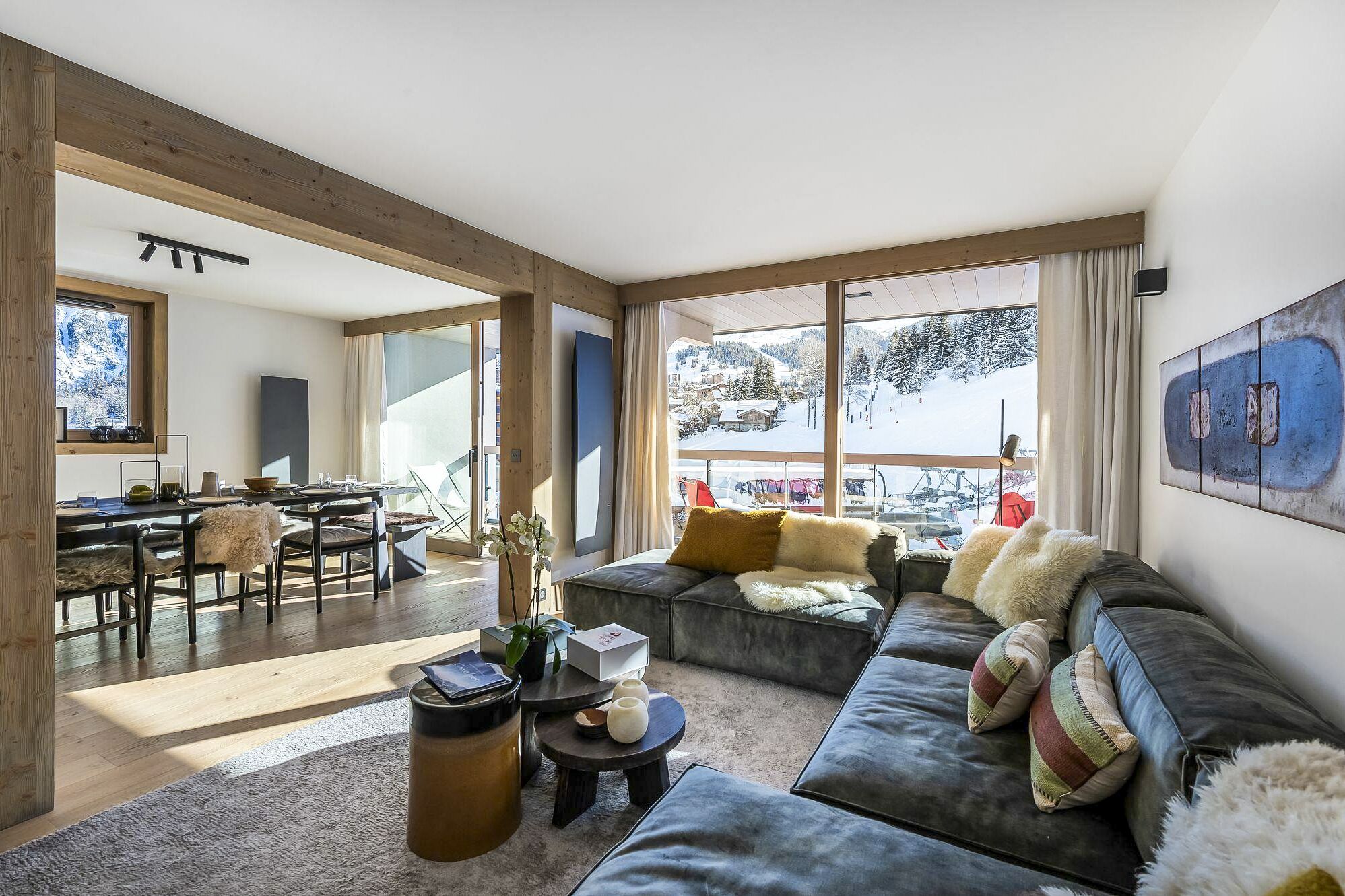 The spacious living area is bathed in natural light and features an open, modern kitchen with high-quality appliances that seamlessly blend with the cosy living and dining spaces. Soft, timeless colours, plush materials, and wooden accents create a calming ambience, making it the ideal setting for relaxation and shared moments after a day on the slopes. From here, step out onto the balcony, and you'll be mesmerised by the panoramic view of Courchevel Village, surrounded by a picturesque landscape of snow-capped peaks. It's a breathtaking sight that will undoubtedly enhance your mountain escape.