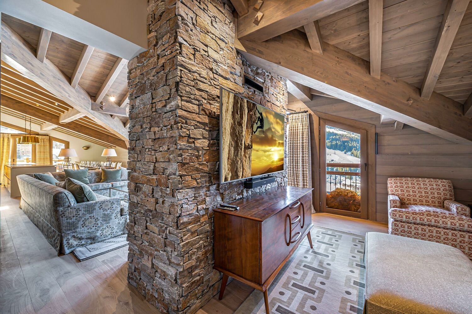 The heart of this luxurious dwelling is the living room, complete with a traditional fireplace, the dining room, and an independent kitchen, all thoughtfully designed to make the most of the available space while providing sweeping panoramic views of the Alpine peaks. Natural materials such as wood, facing stone, and woollen textiles create an intimate and chic ambience, inviting you to relax and unwind.
