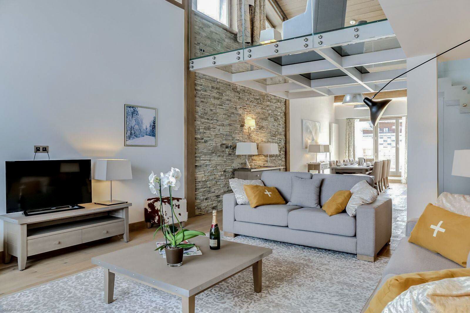 Upon entering the apartment, you'll find a spacious and inviting living area adorned with a unique blend of contemporary decor and soft grey wood accents. The cosy living room is furnished with plush seating, creating the perfect spot to unwind after a day on the slopes. There's a TV and WiFi connectivity for entertainment to stay connected with the world beyond the mountains.