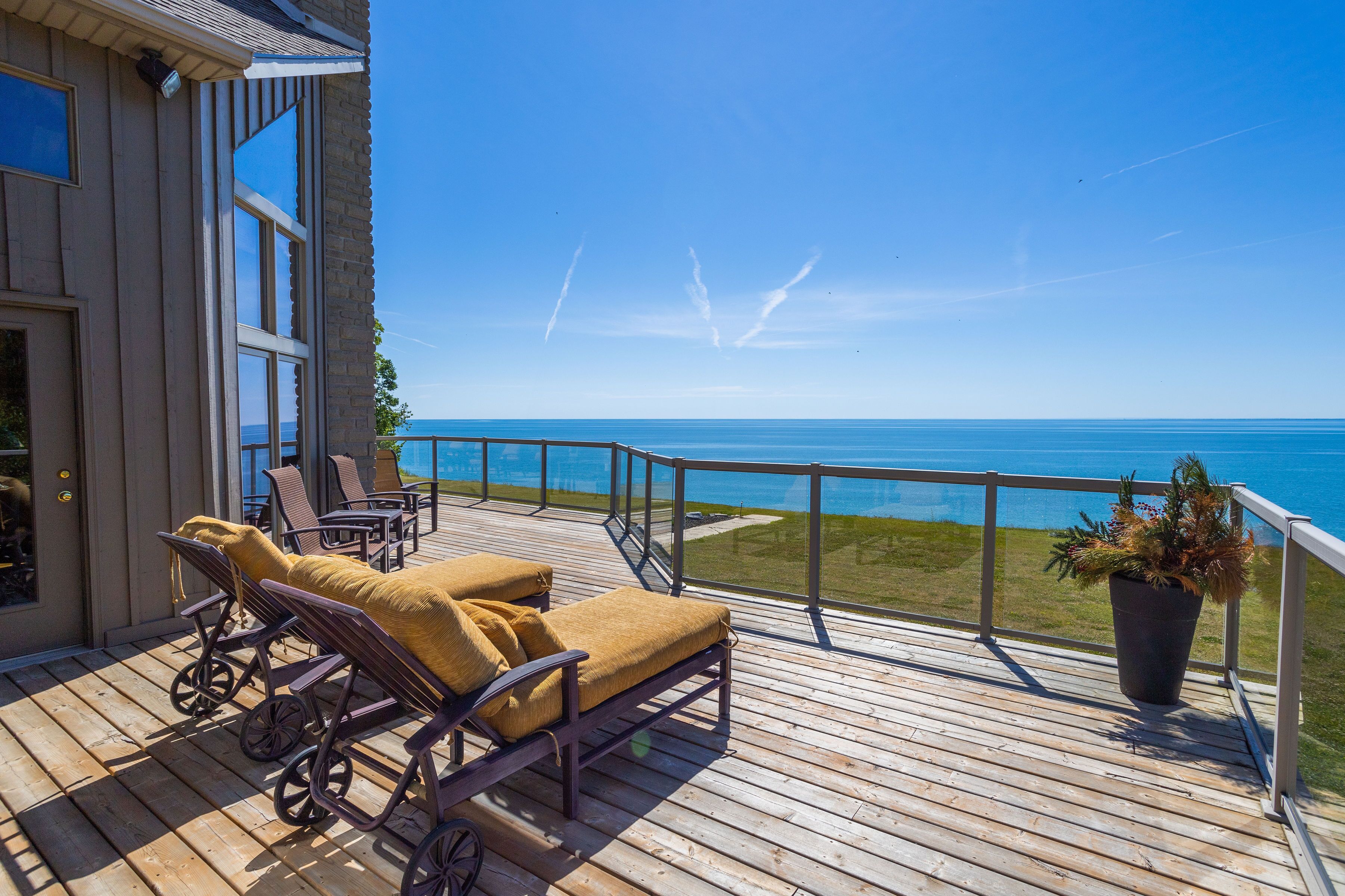 But its #1 feature is the large sprawling outdoor patio and manicured lawn with multiple outdoor seating areas and unobstructed views of Lake Erie. Plus the MASSIVE dock is perfect for swimming or relaxing.