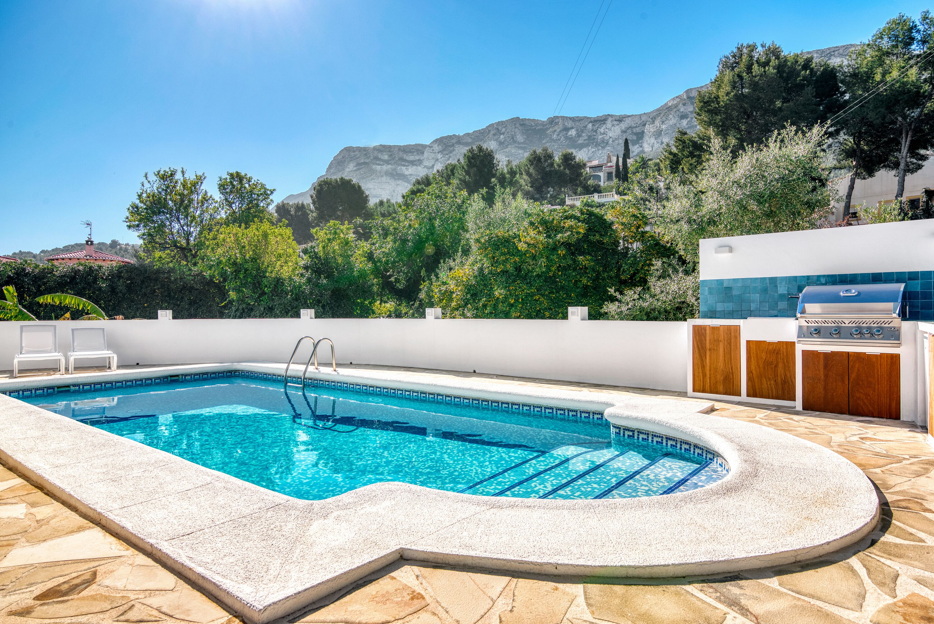 In the 1,100 m² garden with bougainvillea hedges, palm trees and several terraces, you will find sunny and shady spots - with sea views, in the wind-protected courtyard or under palm trees. There are sun loungers, a covered dining area with comfortable furniture and a barbecue. The pool is located below the terrace and offers fantastic views of Montgó and the sea.