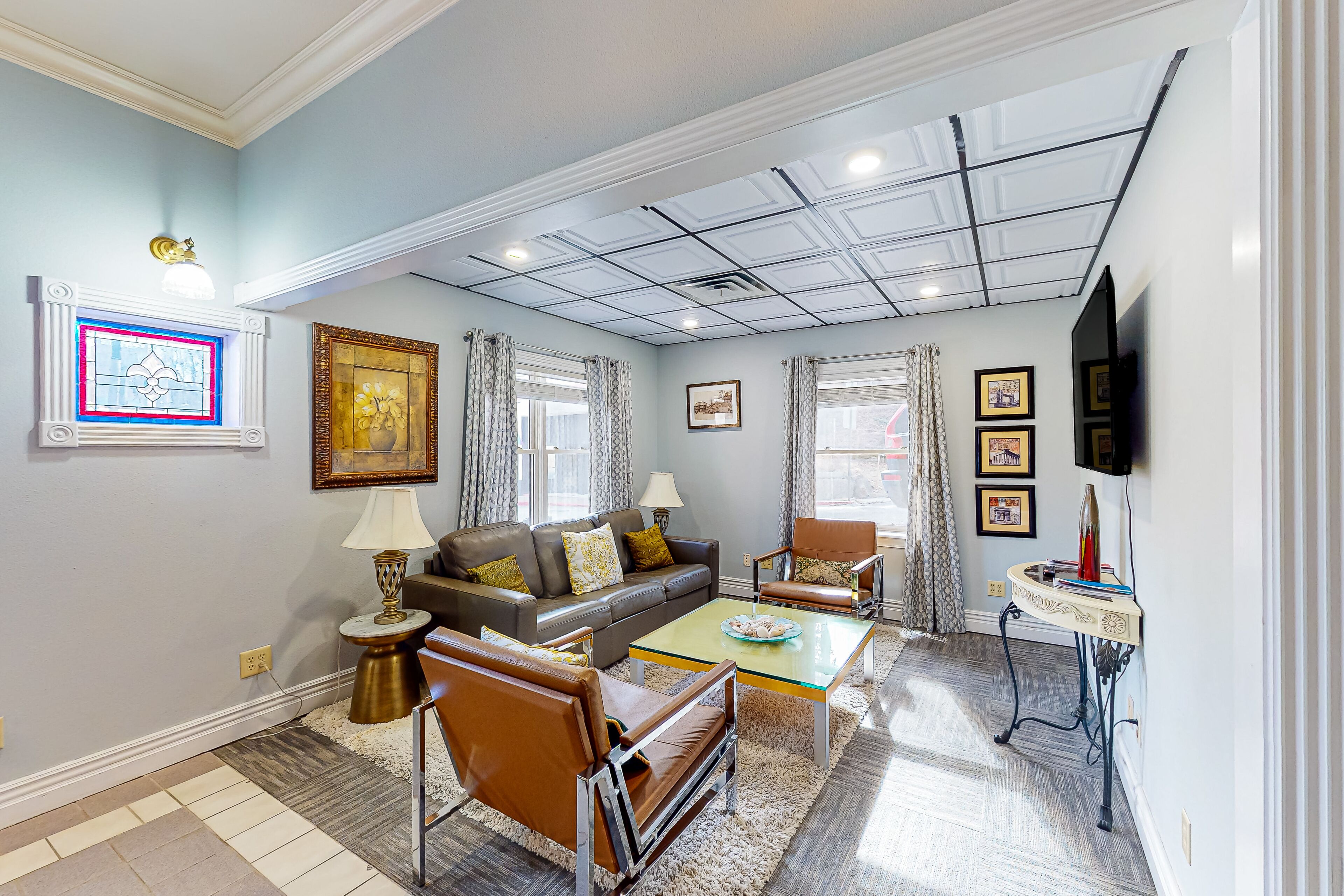 This sleek and modern downtown suite features a stylish living room with plenty of seating and a 60 inch smart TV with streaming capabilities. You’ll love the well-equipped kitchenette complete with a mini-fridge, microwave, coffee maker, and basic glassware for whipping up simple meals.