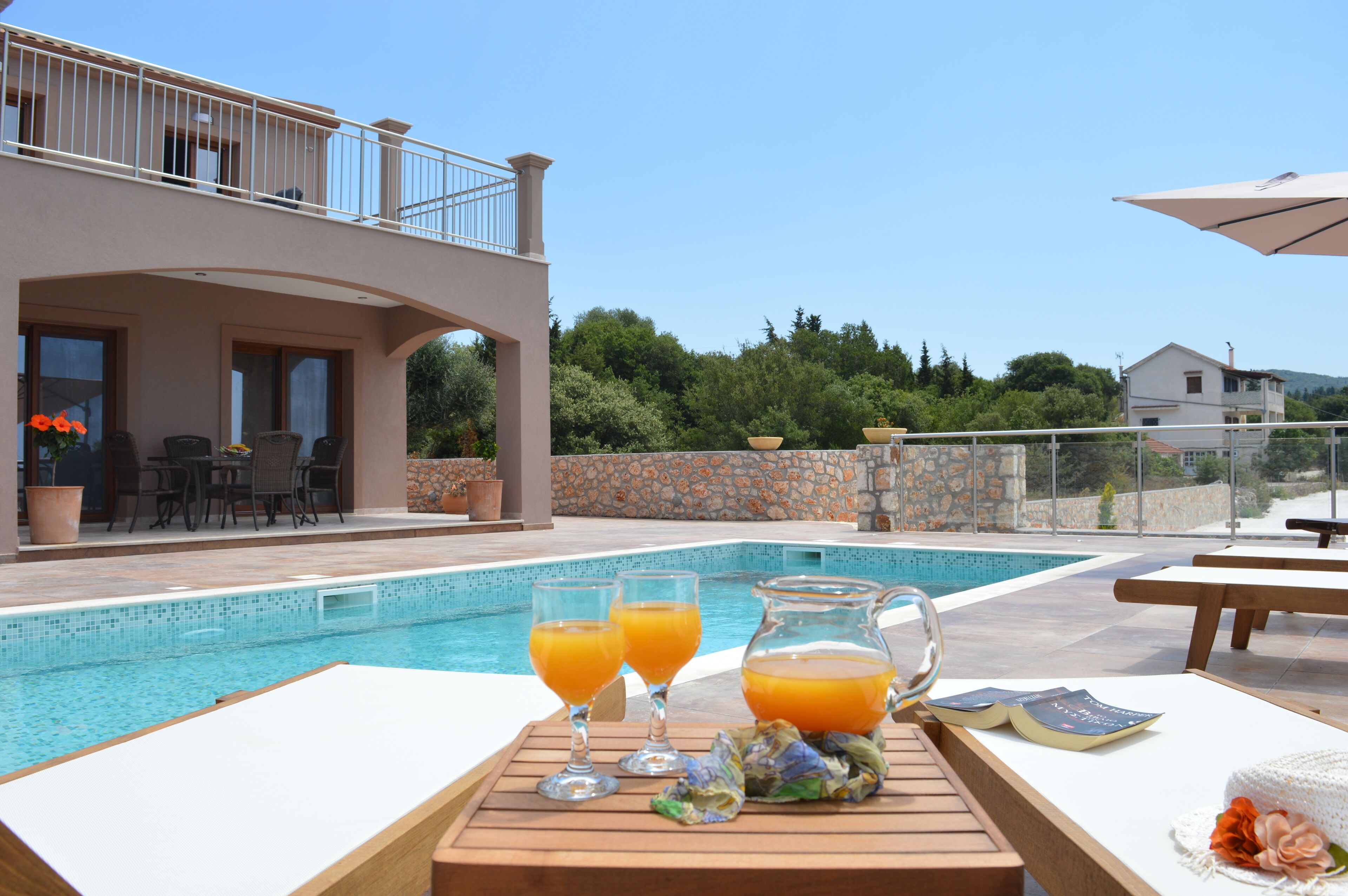 - "Easy to find. We arrived a bit early and we greeted warmly by the hosts who gave us a quick tour. The Villa is spacious and well equipped. Lovely pools. Beautifully landscaped and with a fantastic view out towards the sea and the sunset. Very pastoral with just the tinkle of sheeps bells for company. Several well appointed outdoor areas in sun and shade. Fabulous electric security gate! Good restaurants in Manganos and Fiscardo. Supermarkets well stocked locally. We have had the perfect week. Early October 25 degrees, sunny every day. We have "