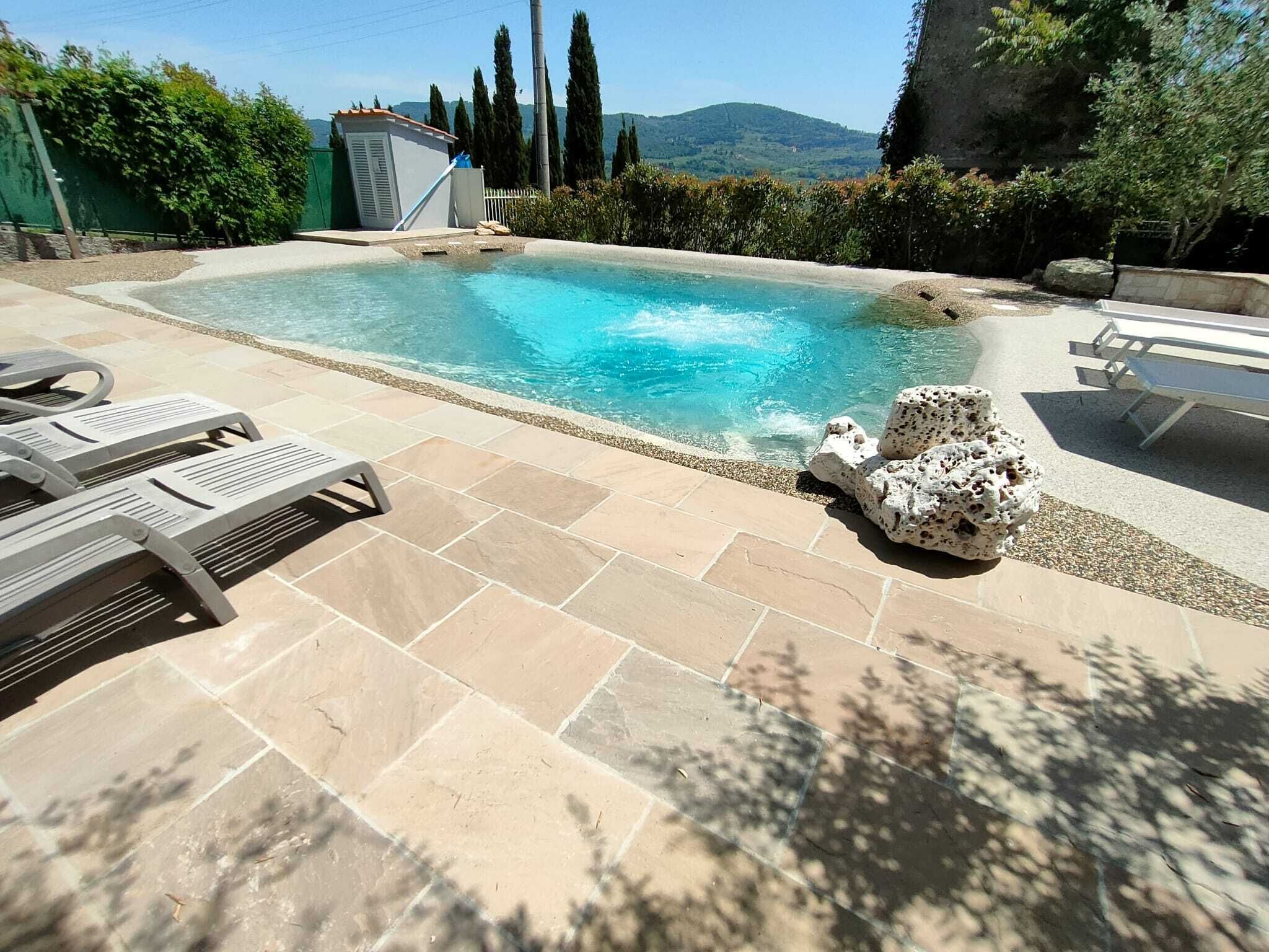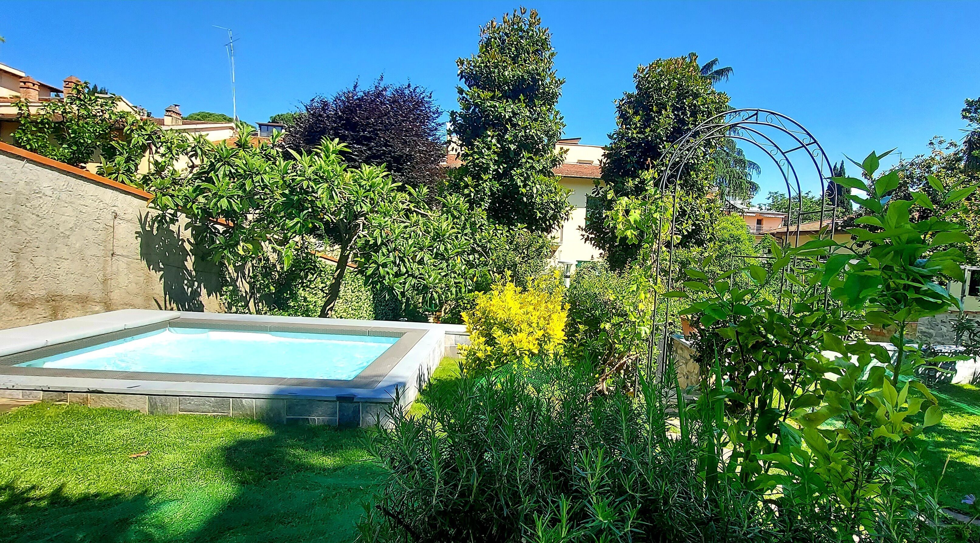 Villa Le Statue has a large garden and a swimming pool measuring 11 x 9 meters with a small beach area where children can play, and around it, equipped with chairs, garden tables, and sun loungers.