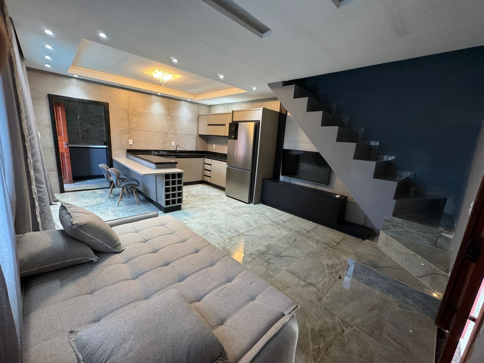 Super luxurious, it is beautifully decorated with modern furniture in earth tones that are inviting and warm. Open kitchen concept features the fully equipped kitchen with stainless steel appliances and wooden countertops, all in white blending with the luxurious ambience of the living room.