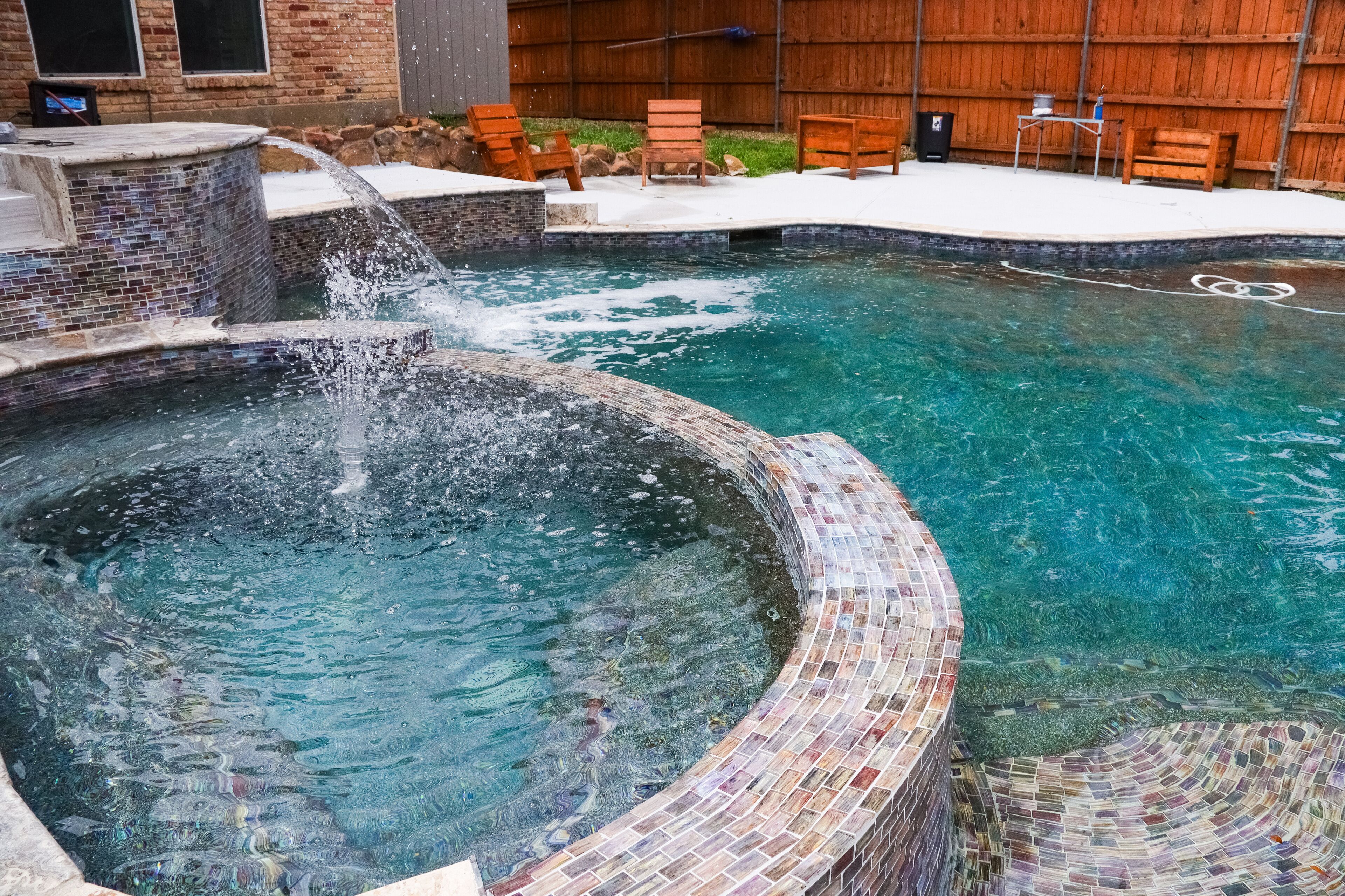 Swimming Pool: The pool has been fully remodeled with new plaster and custom mosaic glass tiles, creating a stunning and inviting centerpiece.