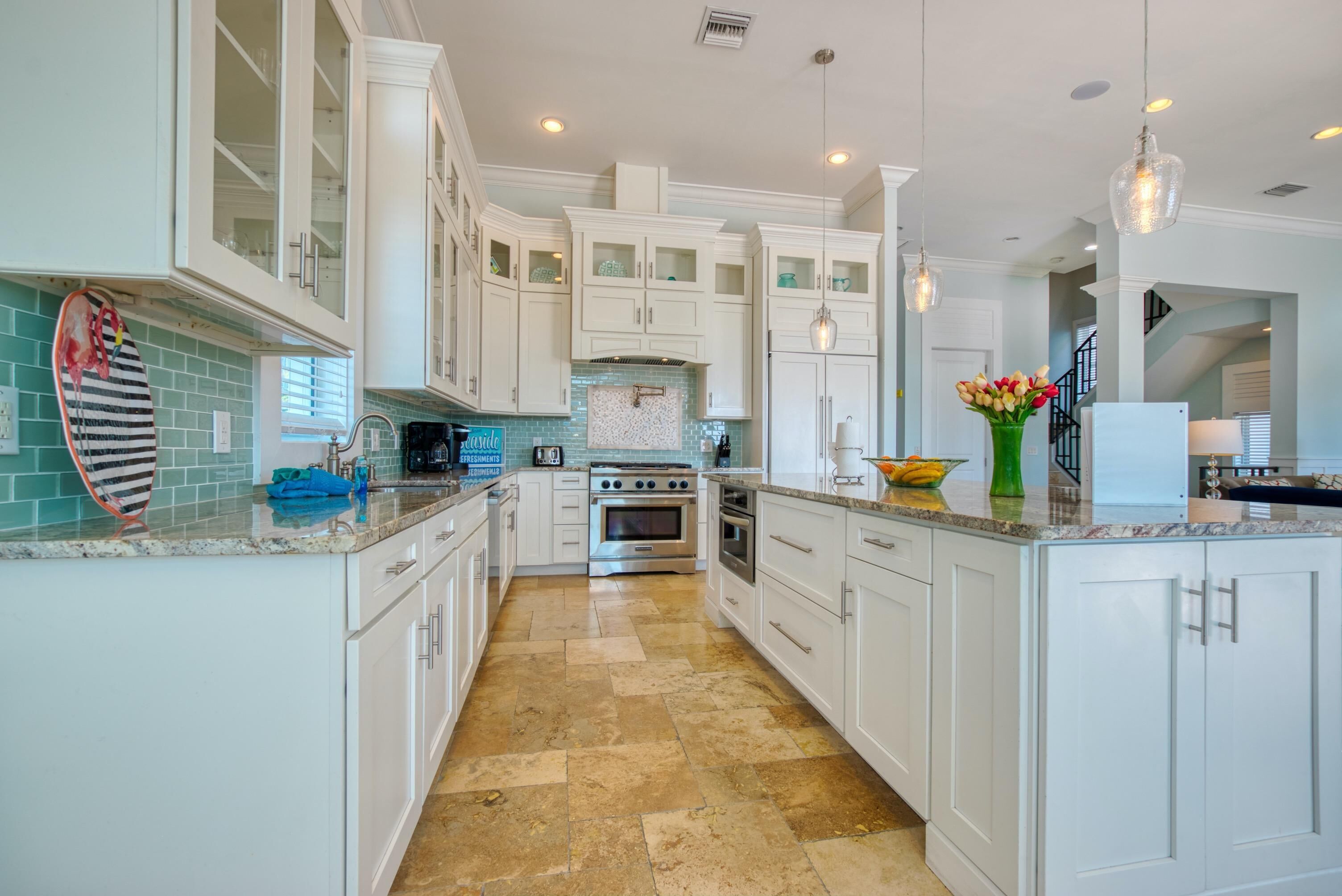 Inside, Seaside Villa Aqua impresses with its high-quality furnishings and amenities, high ceilings, and incredible amount of space. The first floor features the kitchen, living area, guest bathroom, laundry room with washer and dryer, pool area, and master bedroom with en-suite bathroom.