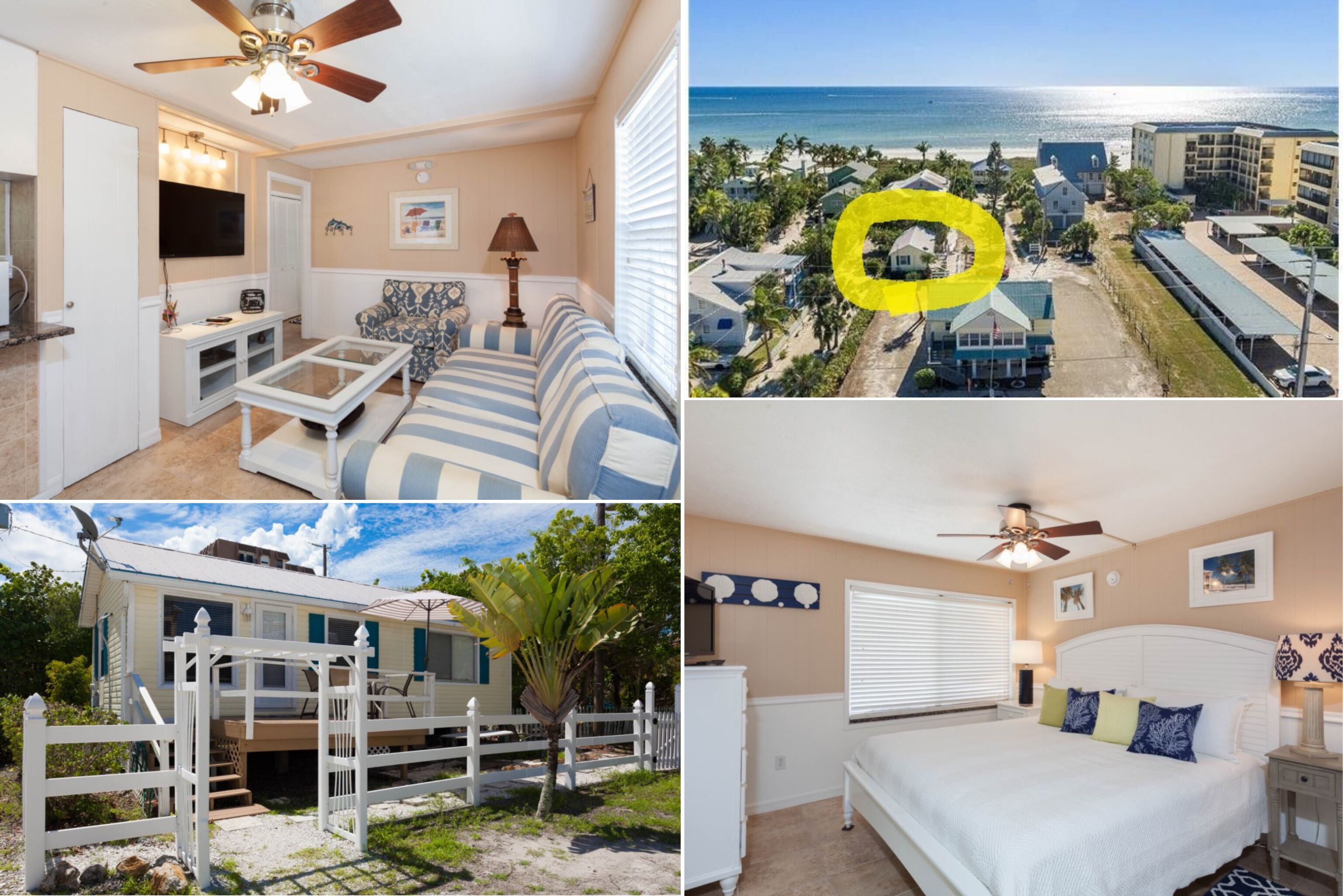 Want to be 90 steps away from the beach? If so, stay at this cute little cottage, and you can! This cottage is located on the same side as the Gulf of Mexico and has a private walking path to get you to the beach. You will also enjoy a private entrance & private parking next to this cottage. This cottage has 1 bedroom, 1 bathroom and sleeps up to two people. As you walk up to the entrance, you’ll notice a small deck with a table and chairs. As you enter the cottage, the first you’ll see is the breakfast nook/ dining area with a table and four chairs to your left. Straight ahead of you is the kitchen. It has modern appliances, granite countertops, and a breakfast bar with two stools. To your right is the cozy living room with a large sofa, arm chair, and flat screen TV mounted to the wall. There is one bedroom, the master bedroom. It has a king-size bed and its own flat screen TV. You're just minutes from downtown Fort Myers Beach where there is always something to do! Eat, drink, and be merry! Or catch up with the local musicians, and enjoy their music at just about every restaurant, and bar.